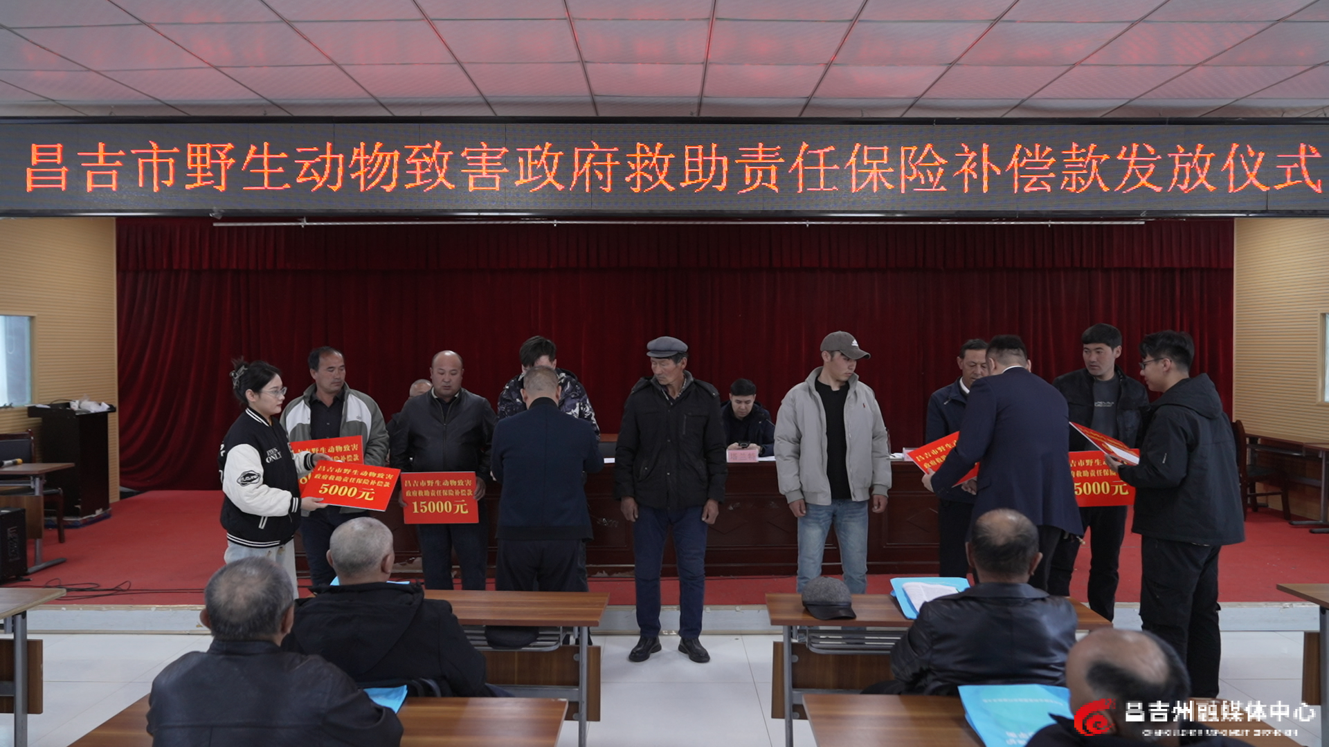 昌吉市首例野生动物致害政府救助责任保险补偿款发放仪式上,工作人员为受损7户牧民集中发放赔付金4.5万元,把惠民措施落到实处。记者常建洋 摄