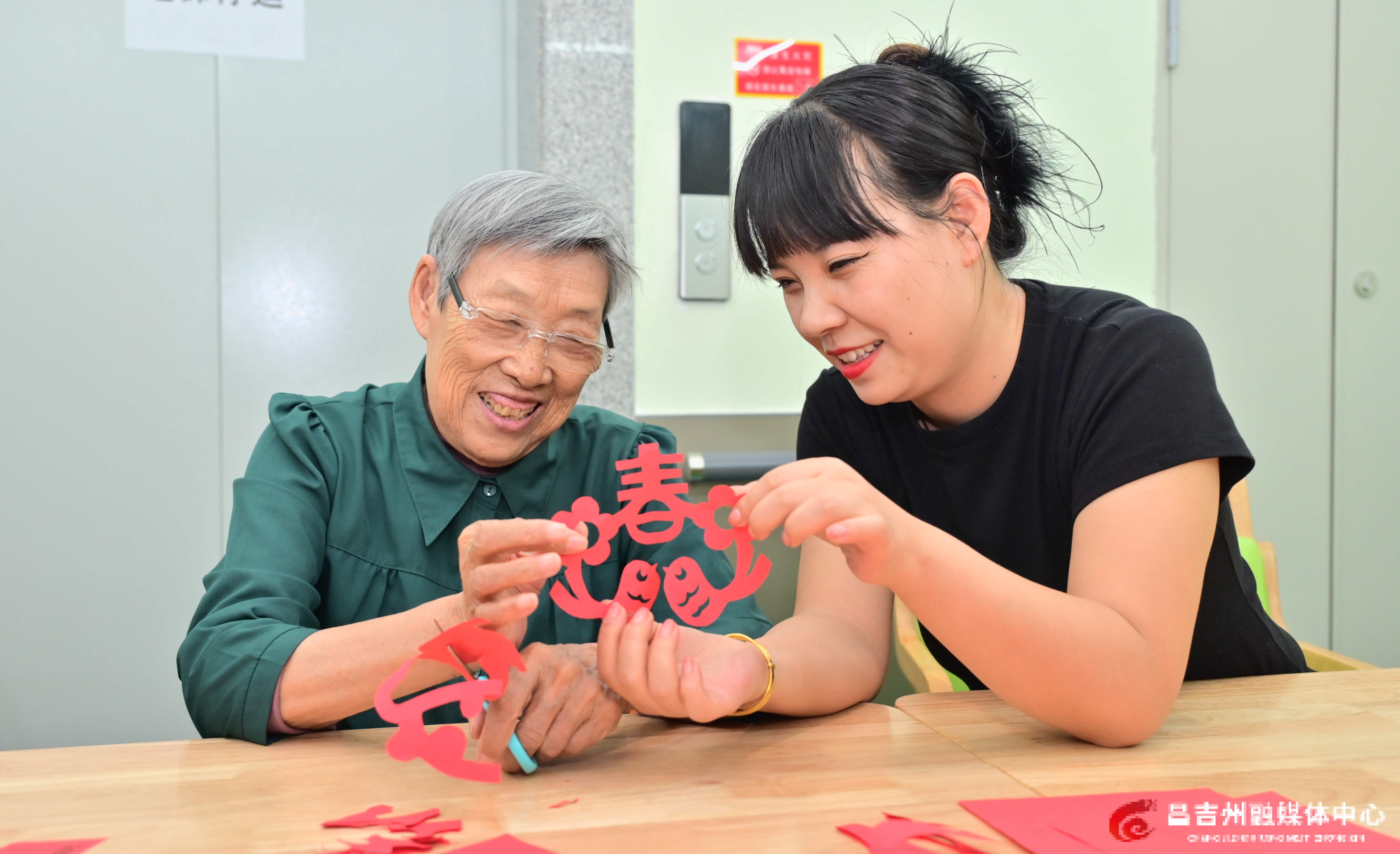 2026年3月24日,在吉木萨尔县吉福星老年康养院里,护理人员正指导老人进行剪纸创作。