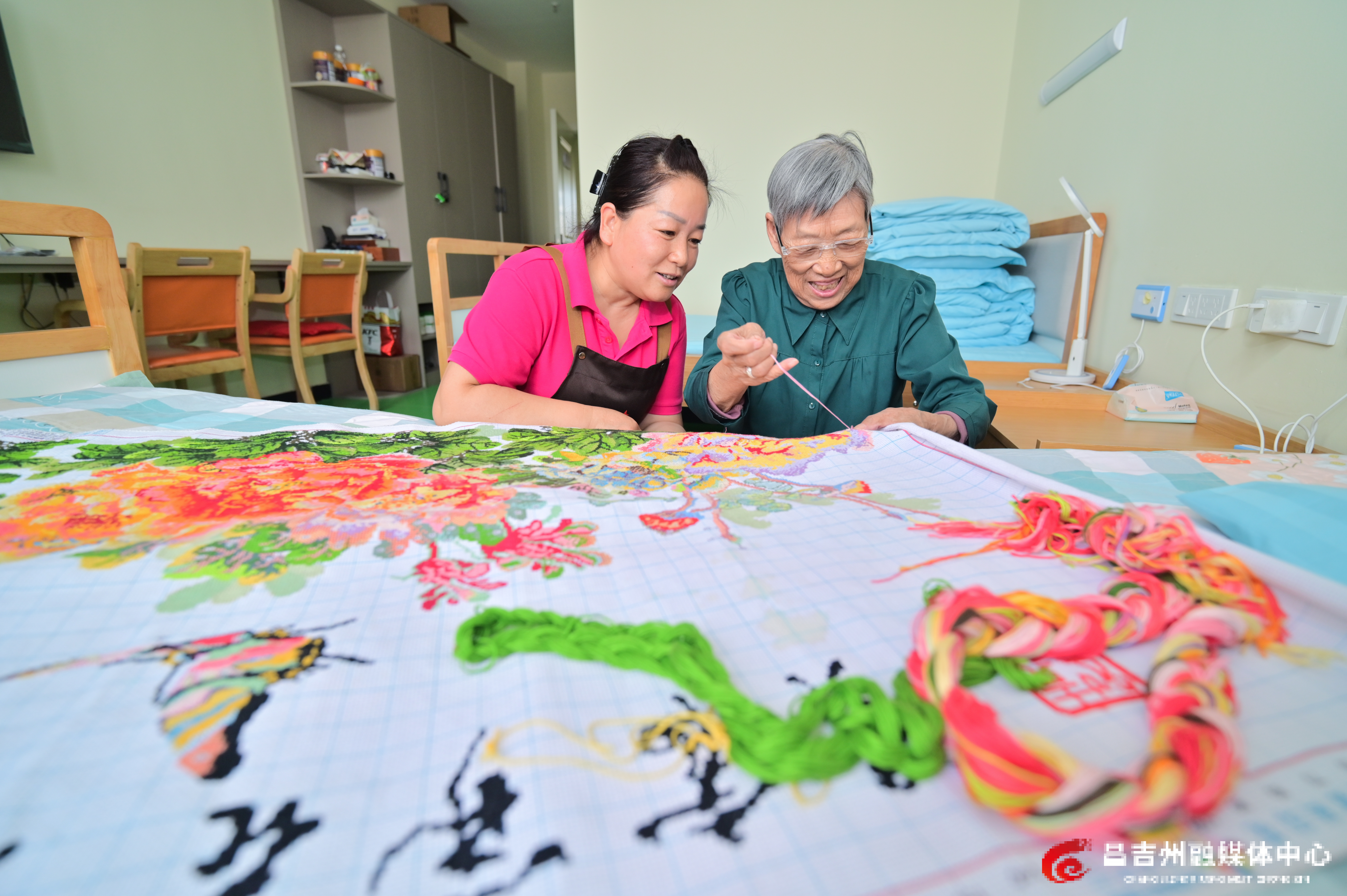 2026年3月24日,在吉木萨尔县吉福星老年康养院里,护理人员正在陪老人创作十字绣。 摄