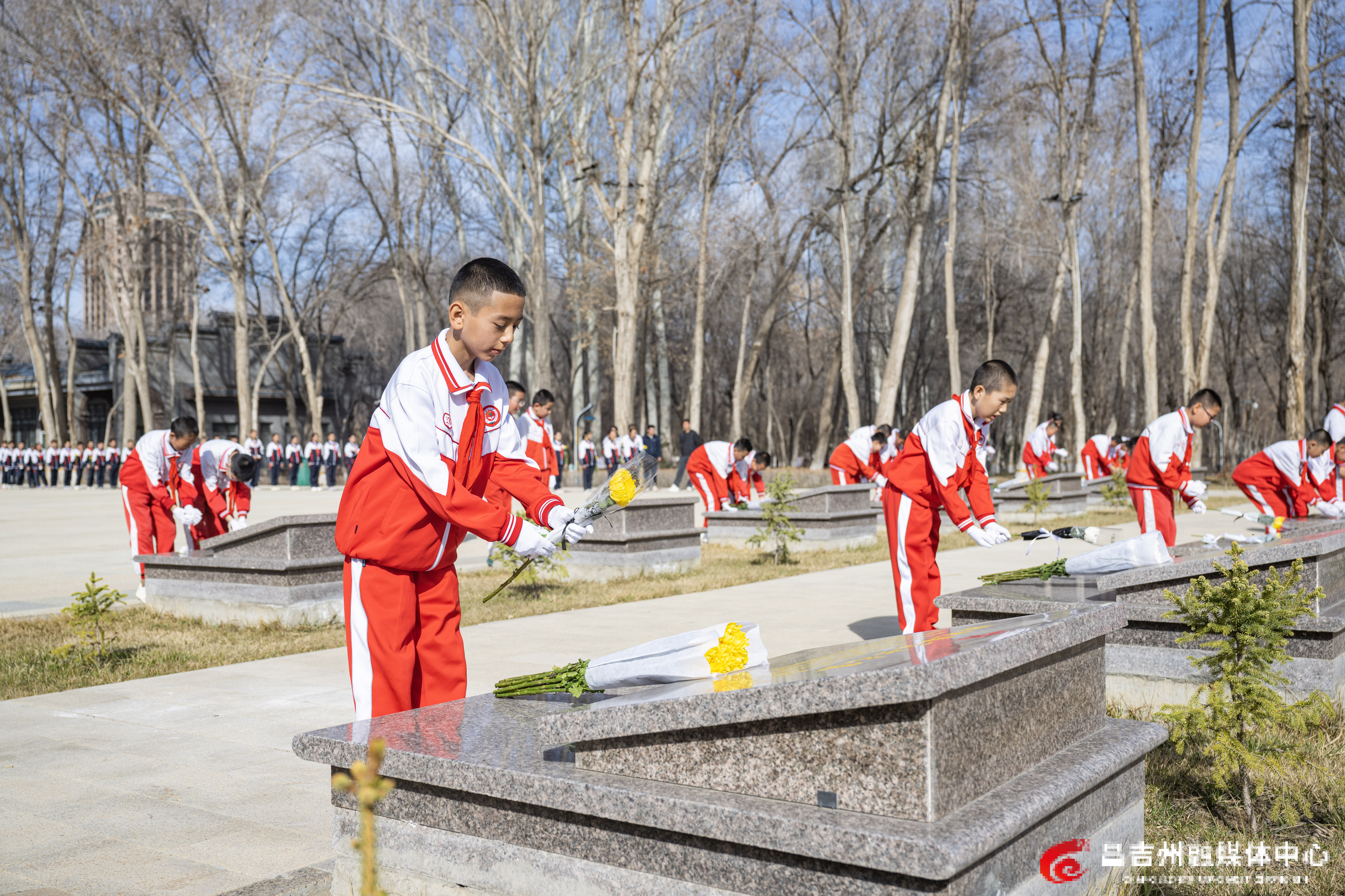 4月1日,奇台县烈士陵园,学生向烈士墓献花。记者何龙 摄
