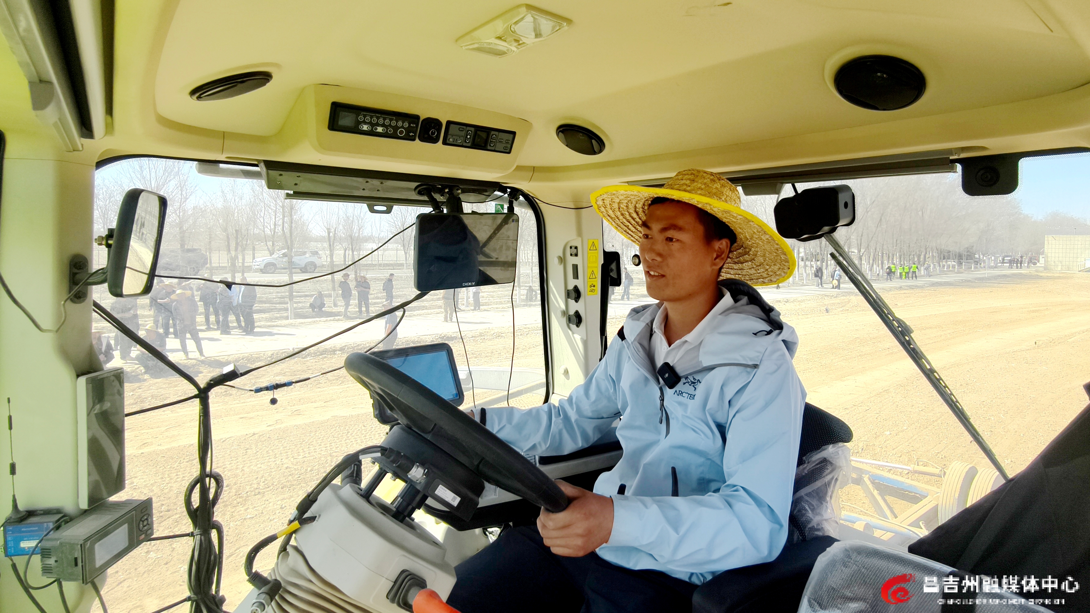 新疆盛泽昌农业专业合作社负责人刘远鑫驾驶新能源拖拉机演示作业。记者王薇 摄
