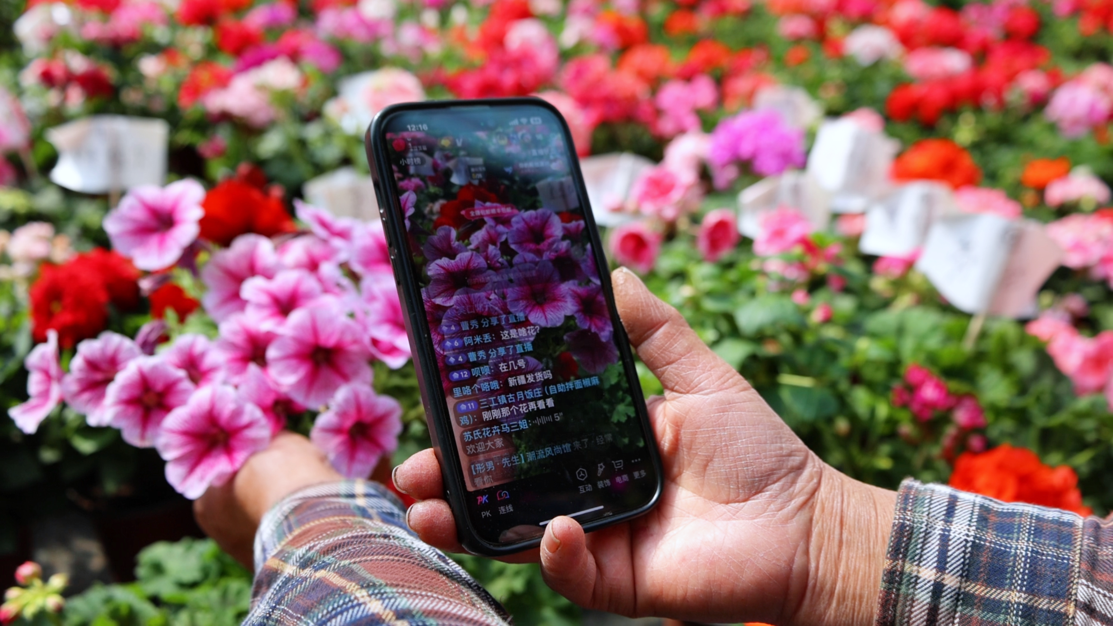 “家人们,大家看天竺葵这个云南紫特别漂亮,大家要喜欢我们家这个云南紫就在我们家46号链接去下单,然后你在下面备注云南紫,也可以备注紫气东来。19.9米包邮到家,而且给大家发的是顺丰,全疆发货、全疆包邮。”合作社负责人马玉周正对着手机直播带货,熟练向网友介绍花卉品种、日常养护技巧,直播间咨询、下单消息不断。