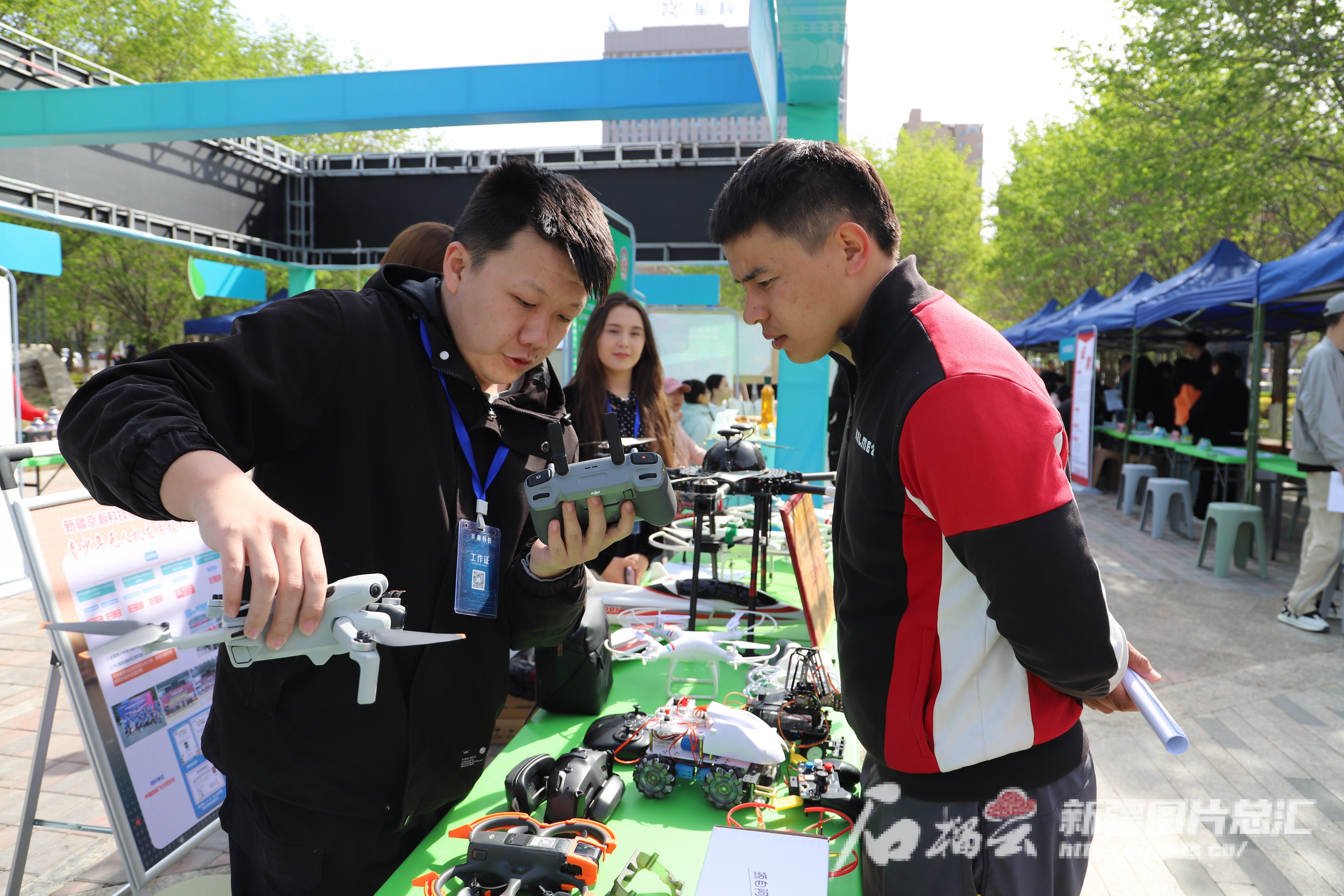4月18日上午,2025年自治区退役军人(军属)专场招聘活动中,新疆京瀚科技服务有限责任公司工作人员向求职的退役军人做无人机产品展示。夏华广摄