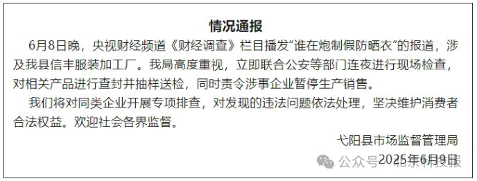 该报道涉及江西省弋阳县信丰服装加工厂、新沂市服装加工厂等。6月9日凌晨,弋阳县市场监督管理局发布通报,已联合公安等部门连夜进行现场检查,对相关产品进行查封并抽样送检,同时责令涉事企业暂停生产销售。弋阳县市场监督管理局表示,将对同类企业开展专项排查,对发现的违法问题依法处理,坚决维护消费者合法权益。