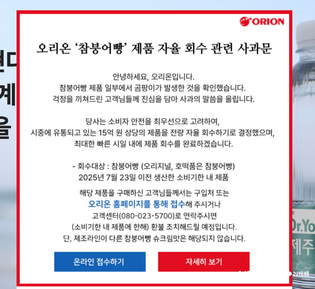 A+ A. A-近日,韩国好丽友在官网发布召回公告称,因在部分“鱼形派”(참붕어빵,又译“鱼形蛋糕”“鲫鱼蛋糕”)中发现了霉菌,决定对市场上流通的相关产品进行自主召回,涉及产品价值约15亿韩元(约合人民币784万元)。