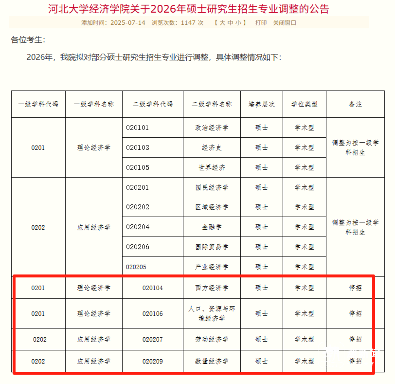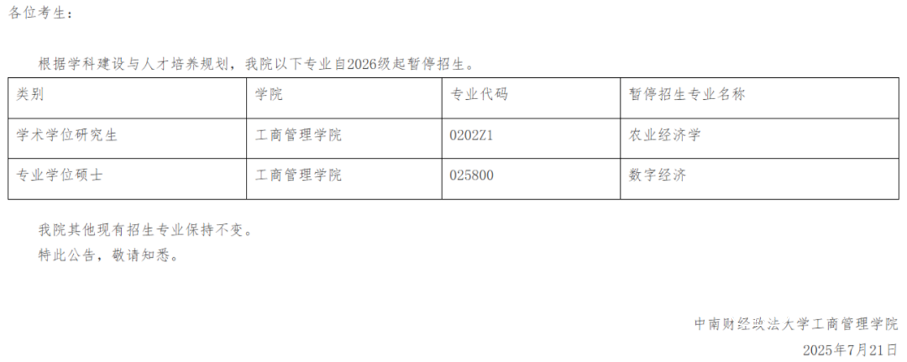 农业经济学(0202Z1)、数字经济(025800)自2026级起暂停招生。