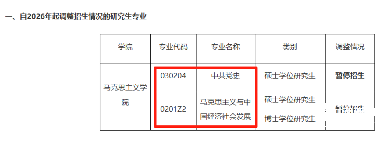 030204中共党史、0201Z2马克思主义与中国经济社会发展暂停招生。