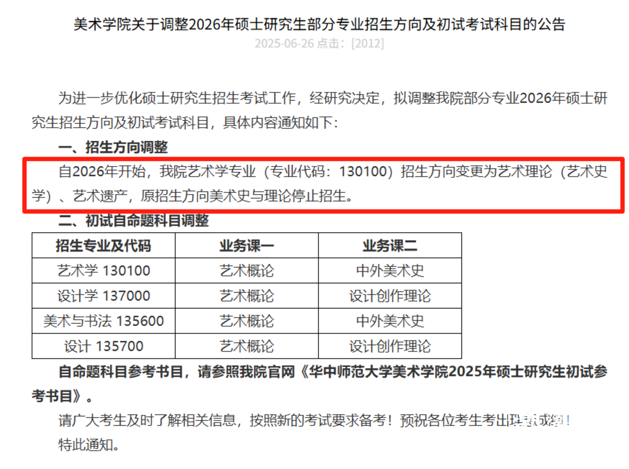 艺术学专业(专业代码:130100)招生方向变更为艺术理论(艺术史学)、艺术遗产,原招生方向美术史与理论停止招生。