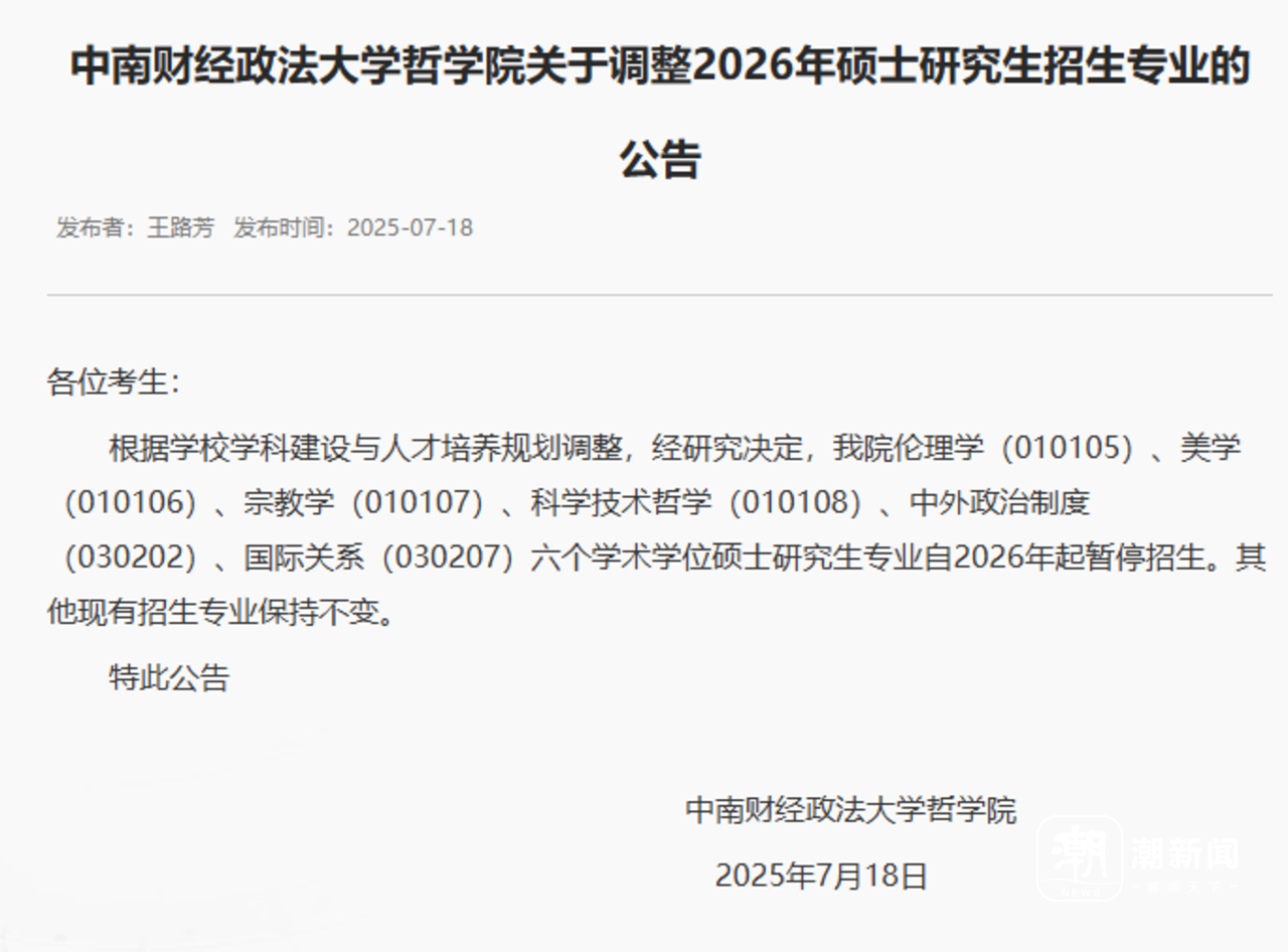 伦理学010105、美学010106、宗教学010107、科学技术哲学010108、中外政治制度030202、国际关系030207暂停招生。