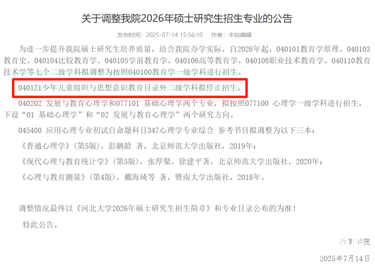 0401Z1少年儿童组织与思想意识教育目录外二级学科拟停止招生。