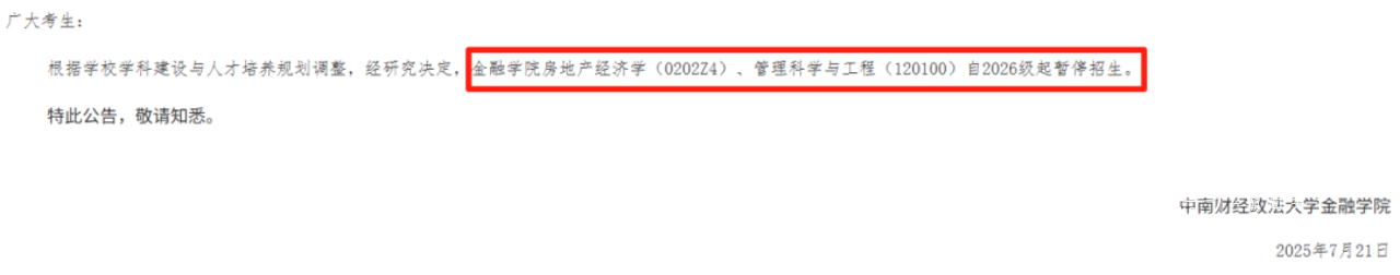 房地产经济学(0202Z4)、管理科学与工程(120100)自2026级起暂停招生。