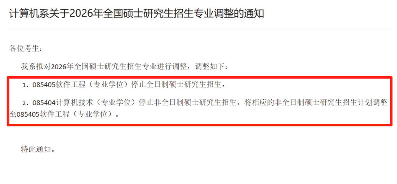 085405软件工程(专业学位)全日制硕士、085404计算机技术(专业学位)非全日制硕士停止招生。