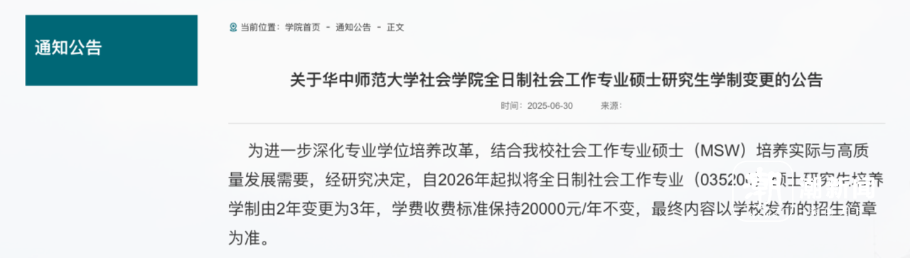 今年6月30日,华中师范大学发布《关于华中师范大学社会学院全日制社会工作专业硕士研究生学制变更的公告》,其中明确提到,自2026年起拟将全日制社会工作专业(035200)硕士研究生培养学制由2年变更为3年。