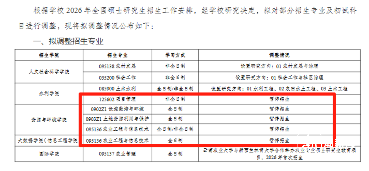 125602 项目管理非全日制、0902Z1设施栽培与环境全日制、0903Z1 土地资源利用与保护全日制、095136 农业工程与信息技术全日制/非全日制、095136 农业工程与信息技术全日制暂停招生。