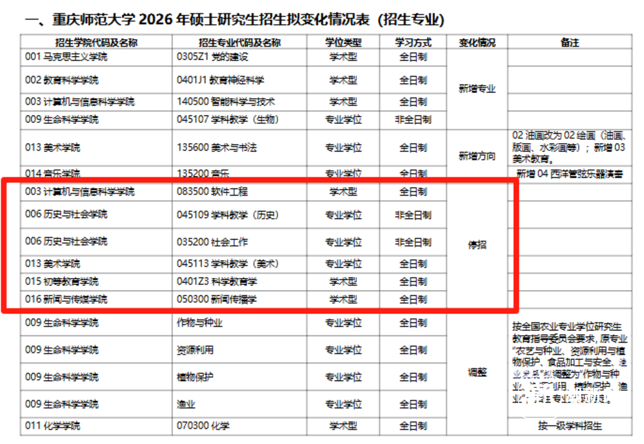 083500软件工程学术型全日制、045109学科教学(历史)专业学位非全日制、035200社会工作专业学位非全日制、045113学科教学(美术)专业学位全日制、0401Z3科学教育学学术型全日制、050300 新闻传播学学术型全日制停招。