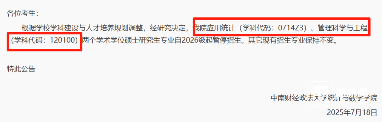 应用统计(学科代码:0714Z3)、管理科学与工程(学科代码:120100)自2026级起暂停招生。