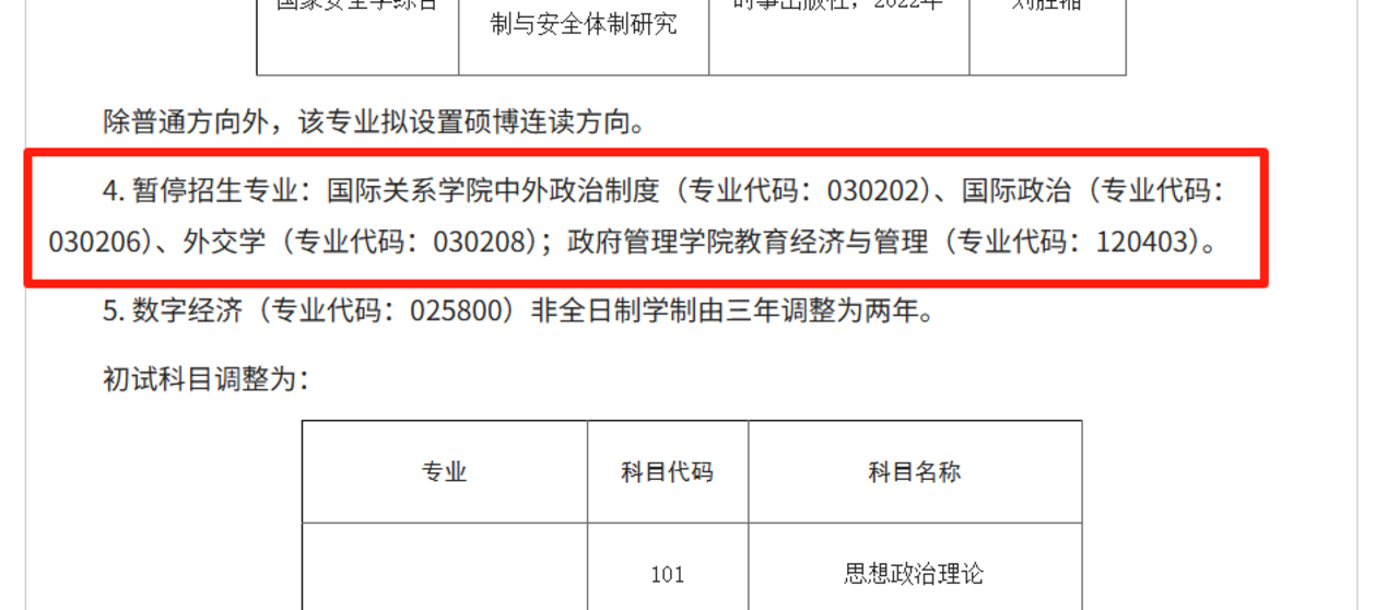 中外政治制度(030202)、国际政治(030206)、外交学(030208)、教育经济与管理(120403)停招。