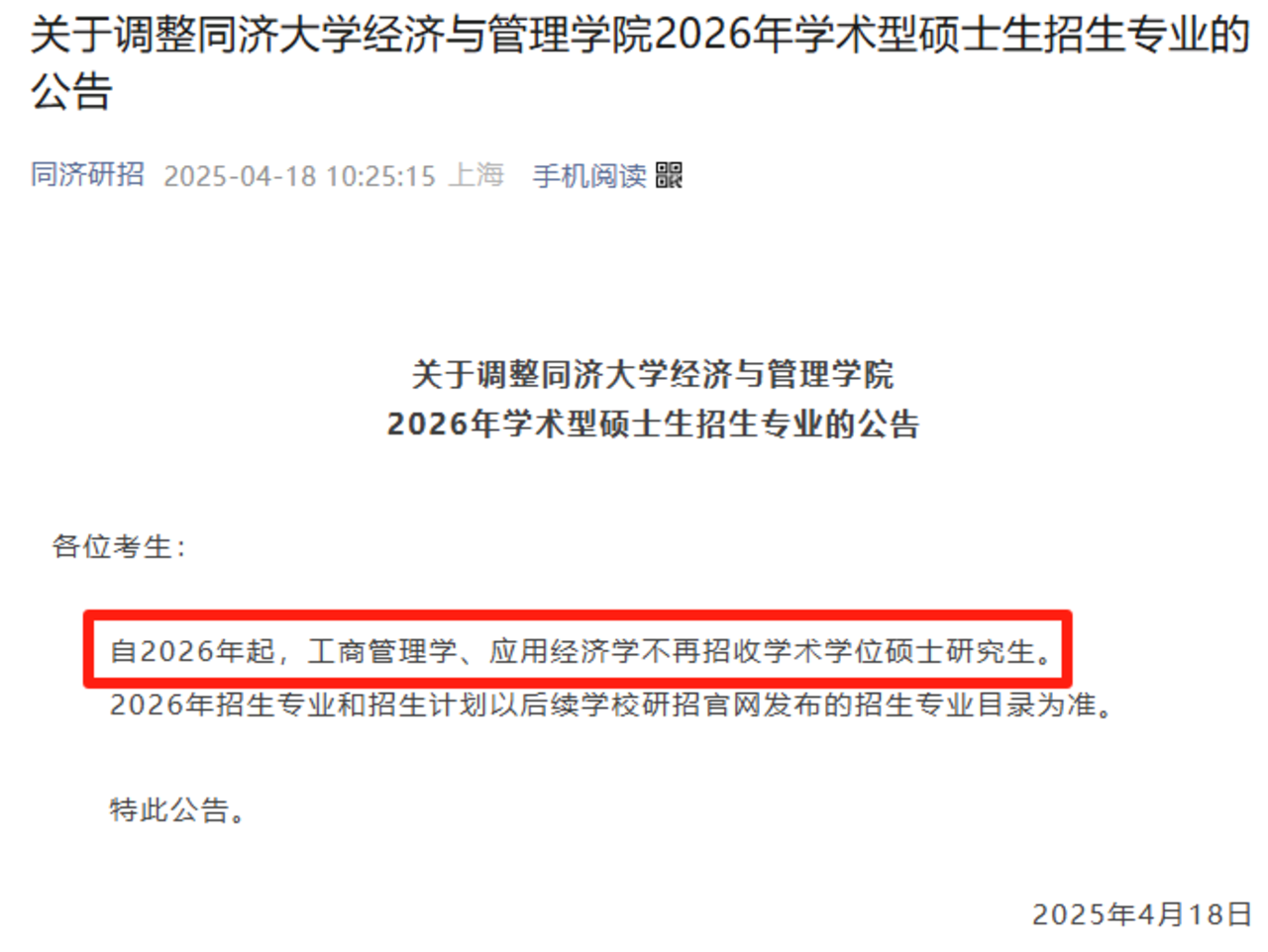工商管理学、应用经济学不再招收学术学位硕士研究生。
