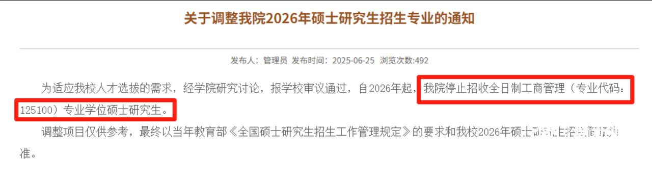 全日制工商管理(专业代码:125100)专业学位硕士研究生停招。