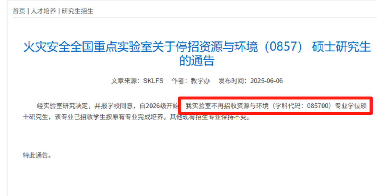 火灾安全全国重点实验室资源与环境(学科代码085700)专业学位硕士停止招生。