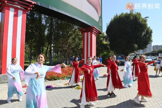 水磨沟区益民大厦前,华光街街道斜井东社区工作人员自编自演舞蹈《美丽新疆》,以优美舞姿展现新疆的壮美与神秘。