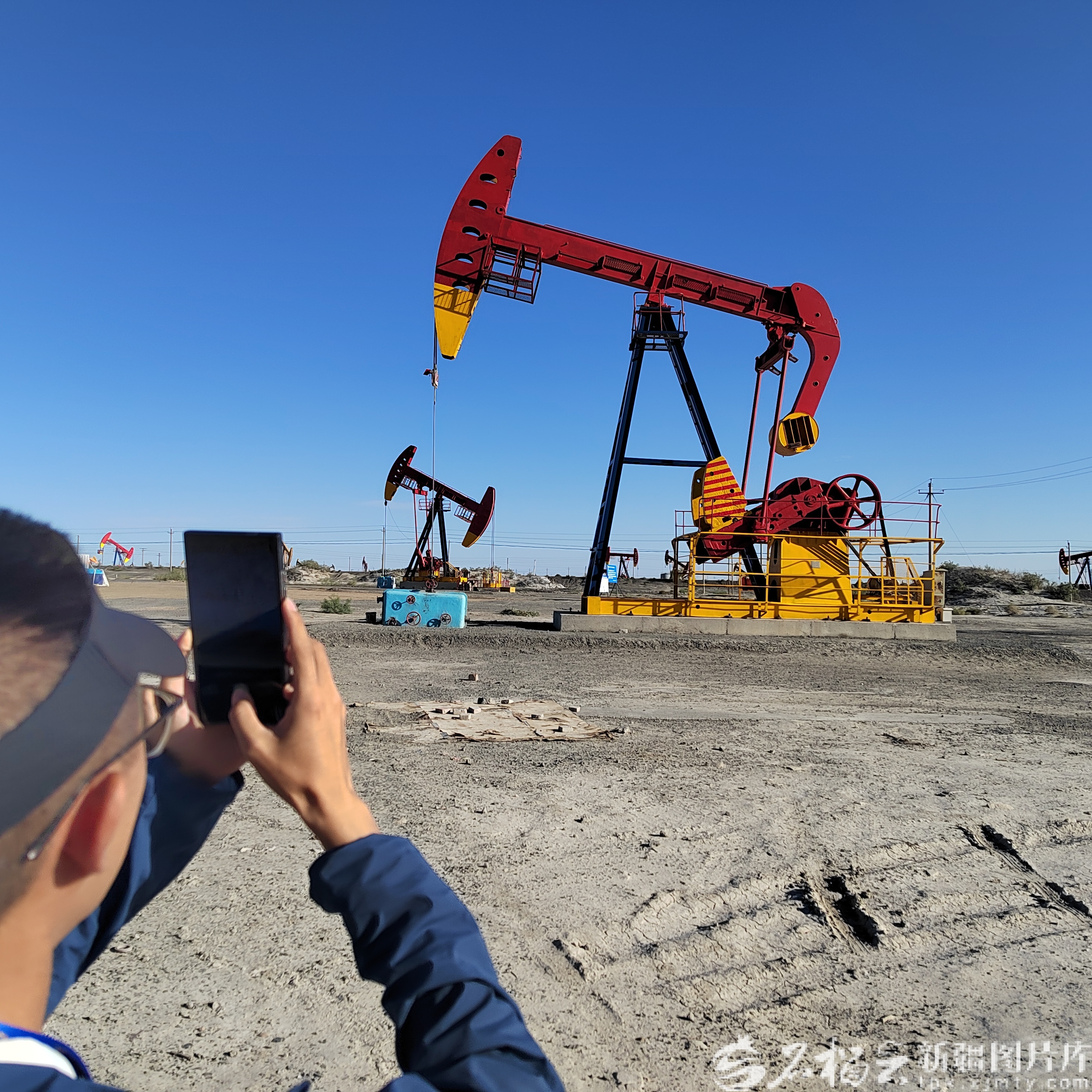 9月12日,“砥砺奋进七十载 天山南北谱华章”大型集中采访活动采访团成员在新疆油田公司采油二厂陈其亮班组采油作业区拍摄抽油机。