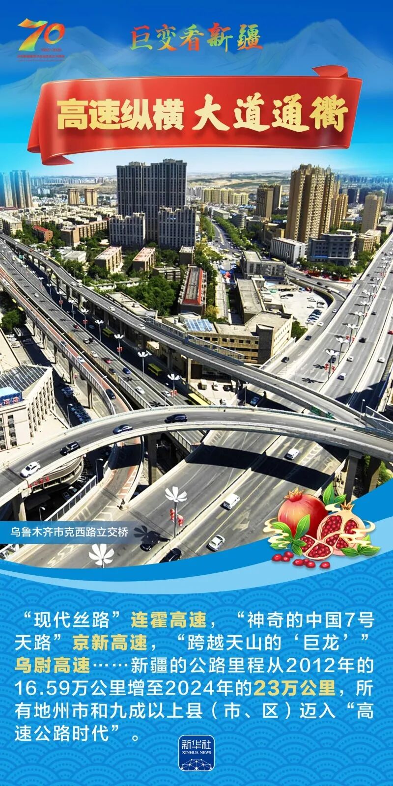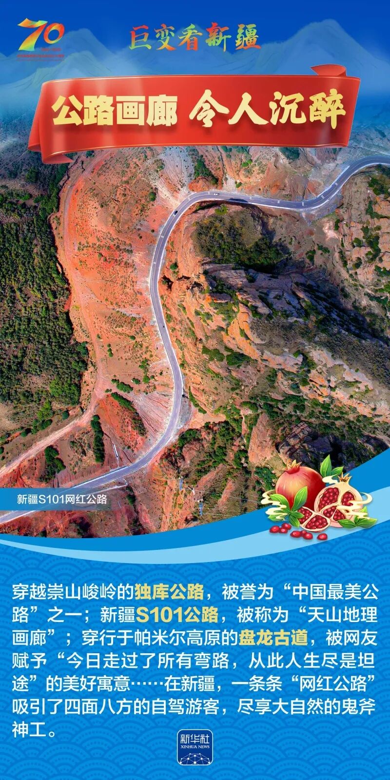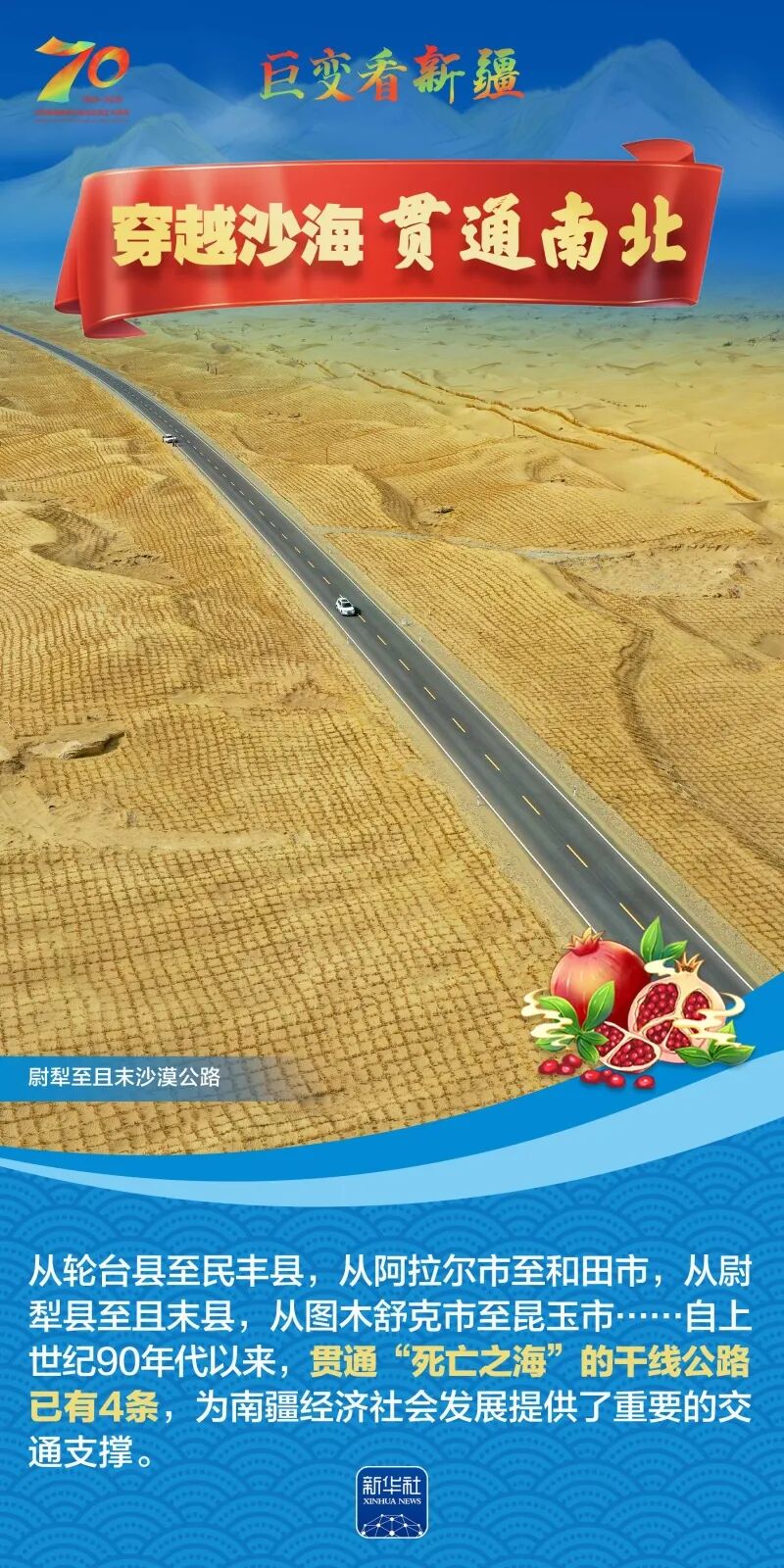A+ A. A-今年是新疆维吾尔自治区成立70周年。70年来,新疆的交通建设日新月异。从驼铃声声、马蹄嘚嘚到铁流纵横、银鹰高翔,一座座交通枢纽辐射四方,一条条“钢铁巨龙”蜿蜒逶迤,一个个支线机场星罗棋布,现代化的新疆立体交通网络日益形成。让我们跟随这组海报,一起见证穿越“三山两盆”、贯通欧亚大陆的新时代新疆交通画卷。