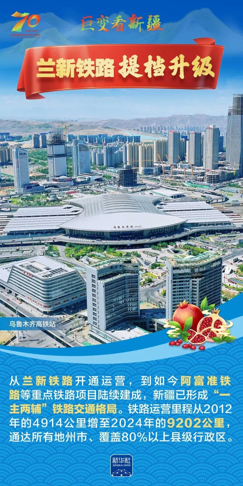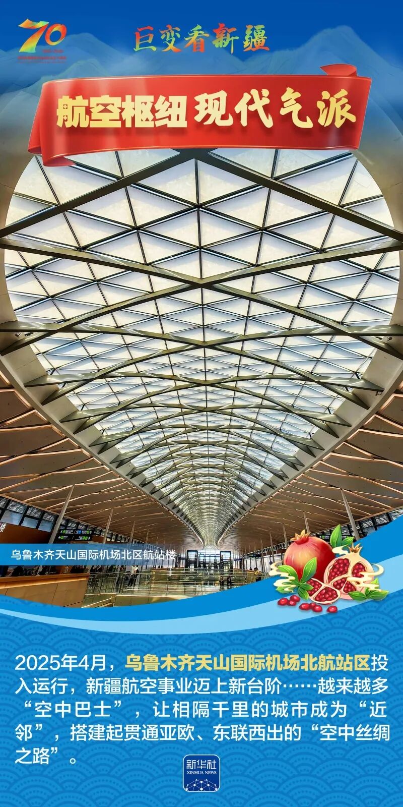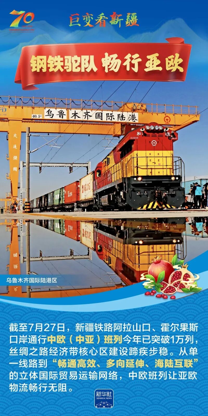 A+ A. A-今年是新疆维吾尔自治区成立70周年。70年来,新疆的交通建设日新月异。从驼铃声声、马蹄嘚嘚到铁流纵横、银鹰高翔,一座座交通枢纽辐射四方,一条条“钢铁巨龙”蜿蜒逶迤,一个个支线机场星罗棋布,现代化的新疆立体交通网络日益形成。让我们跟随这组海报,一起见证穿越“三山两盆”、贯通欧亚大陆的新时代新疆交通画卷。