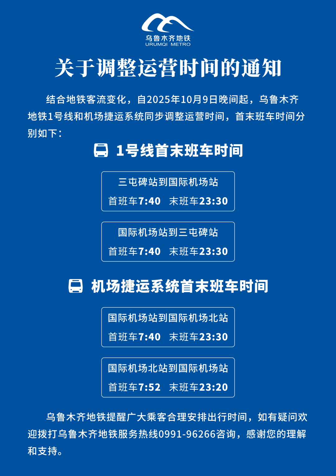 结合地铁客流变化,自2025年10月9日晚间起,乌鲁木齐地铁1号线和机场捷运系统同步调整运营时间,首末班车时间分别如下: