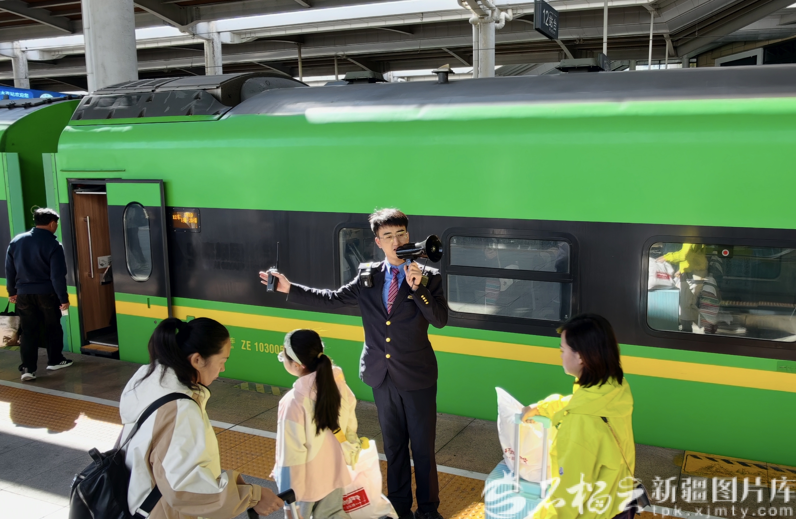 10月3日,一名工作人员在乌鲁木齐站站台前疏导旅客。