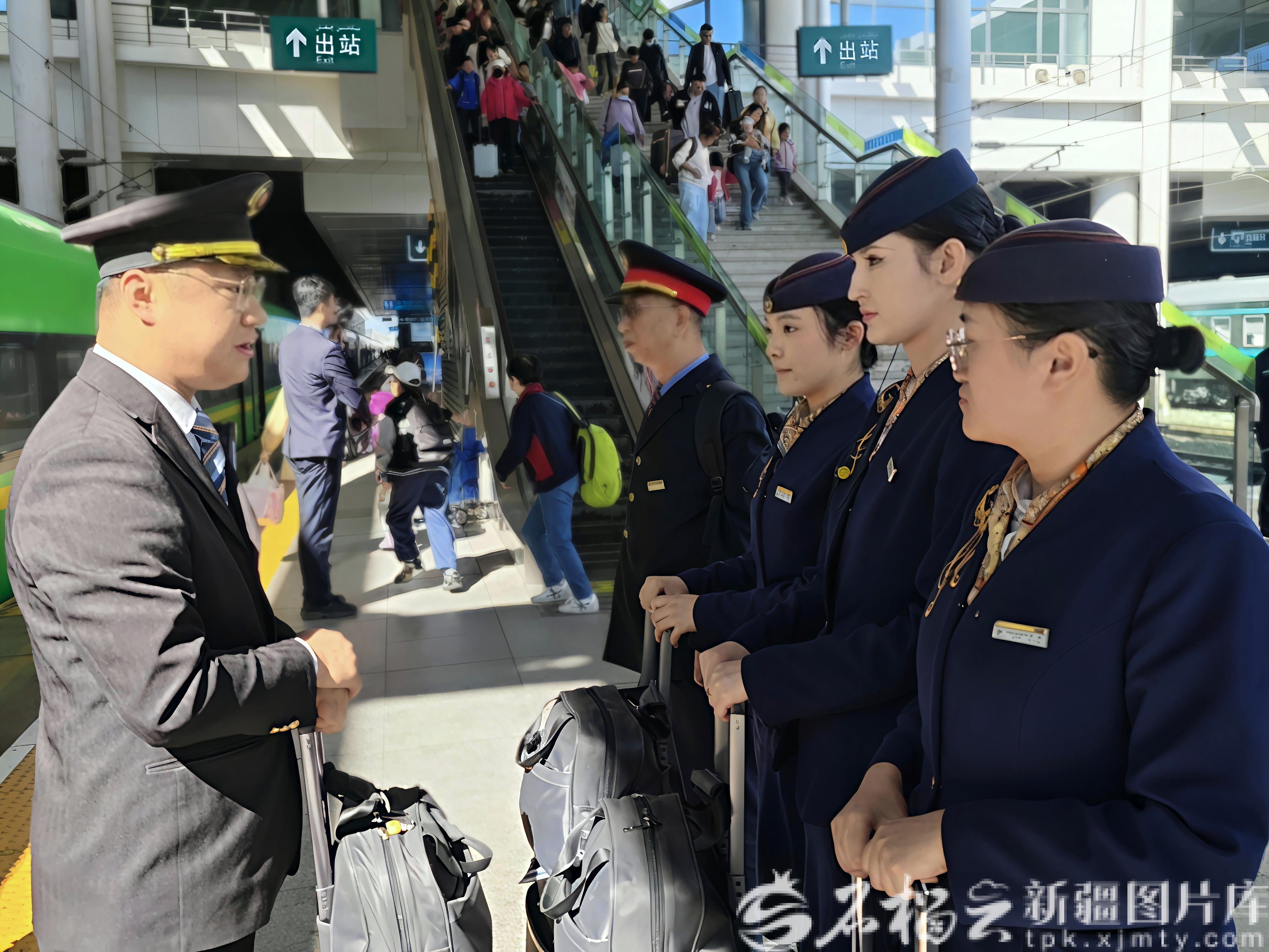 10月3日,在乌鲁木齐站,即将出发的火车服务车组在做出发前准备。