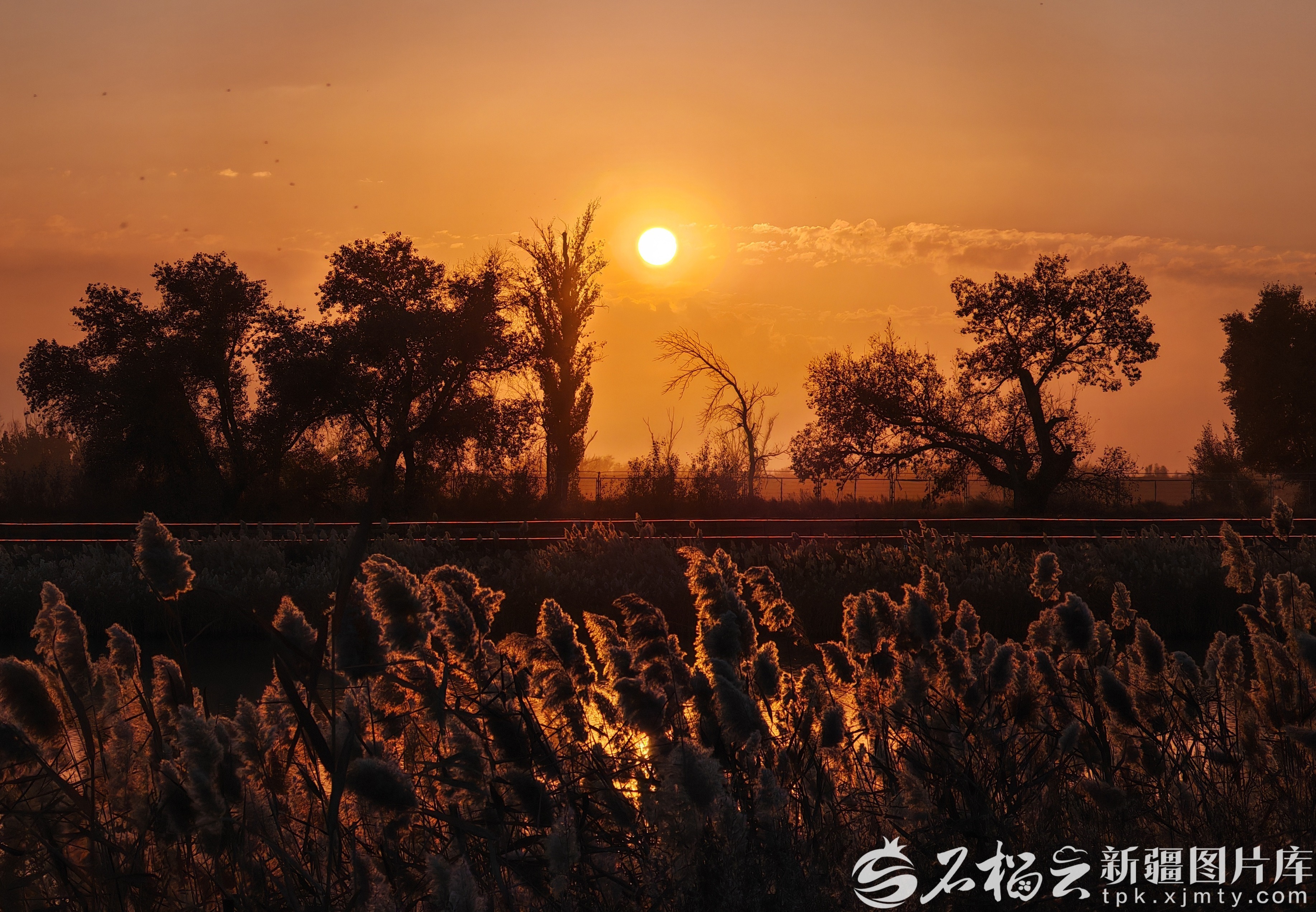 10月30日,夕阳的金辉倾泻而下,昌吉市境内的老龙河胡杨林景区色彩斑斓,美景如画(资料图片)。