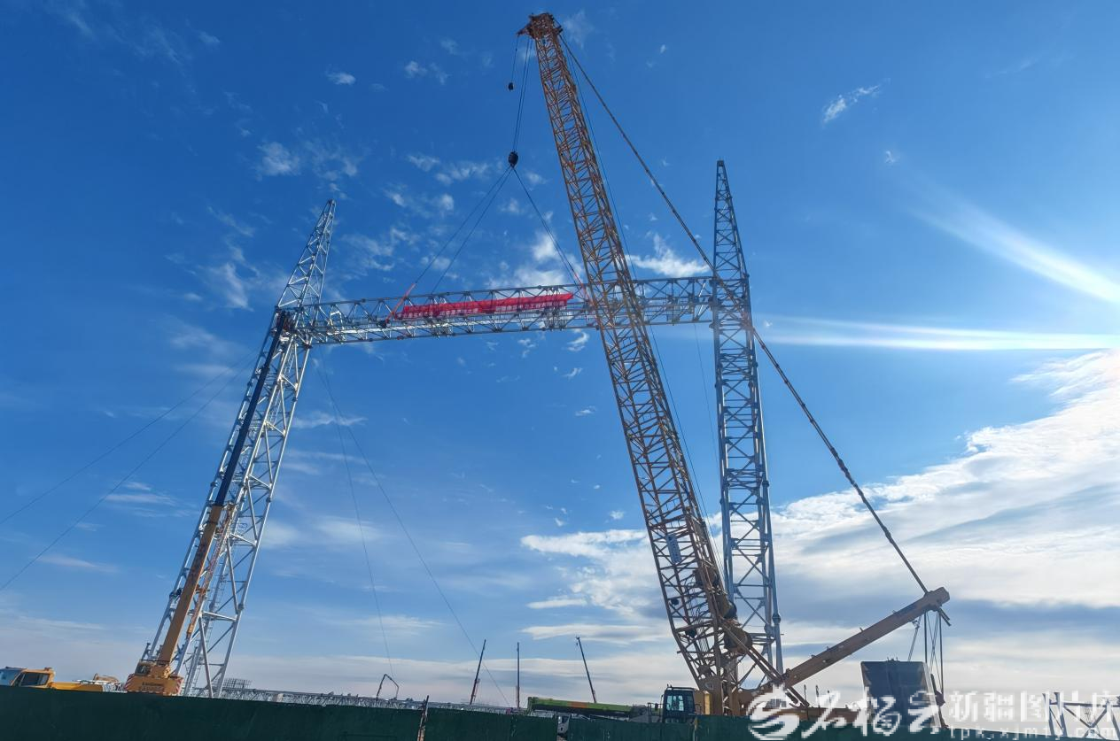 10月15日,位于哈密市巴里坤哈萨克自治县三塘湖镇的玫瑰泉750千伏变电站开展构架吊装。李建彬摄