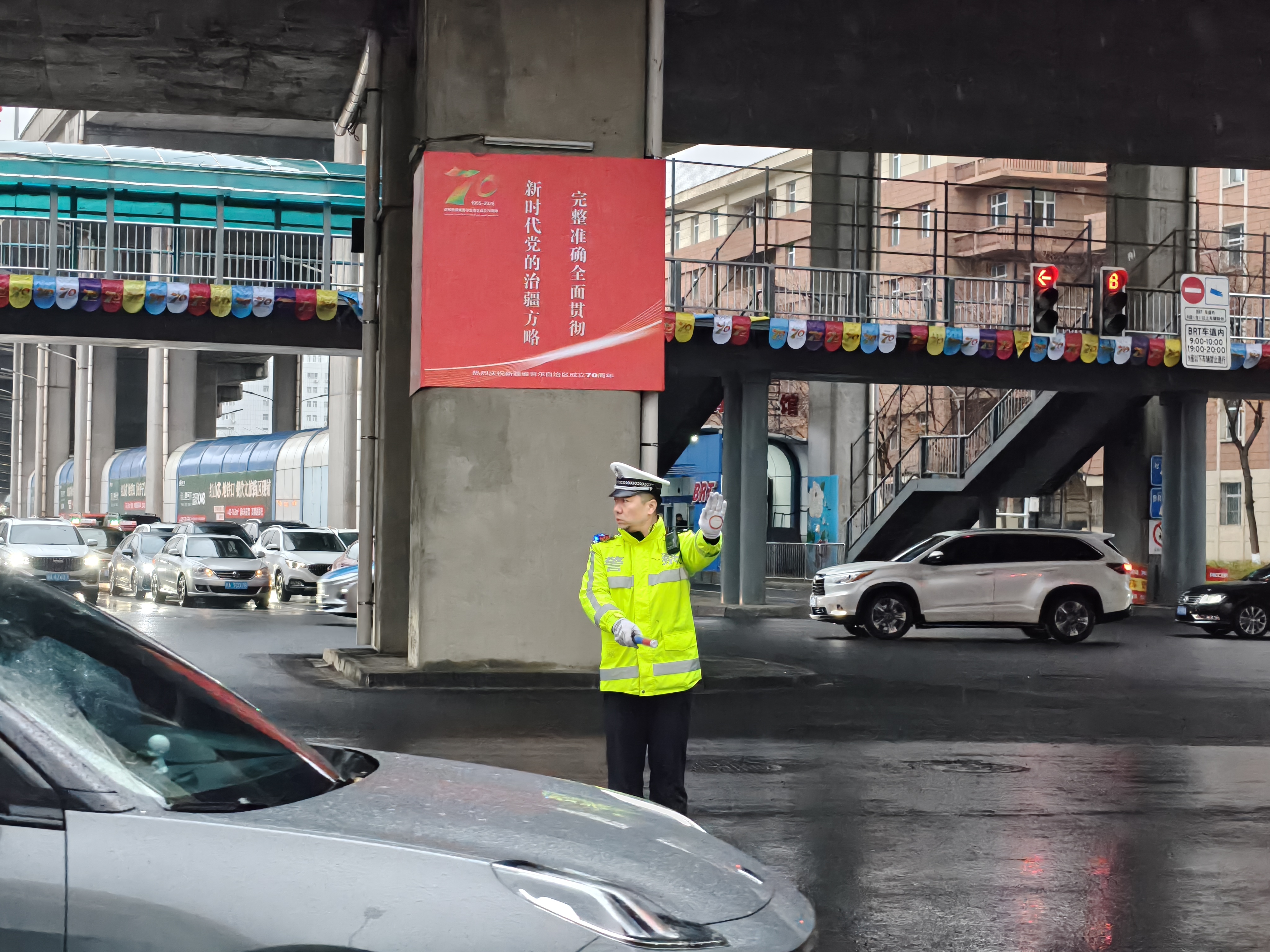11月5日,乌鲁木齐市公安局交管支队沙依巴克区大队西北路中队民警在疏导交通。受访单位供图