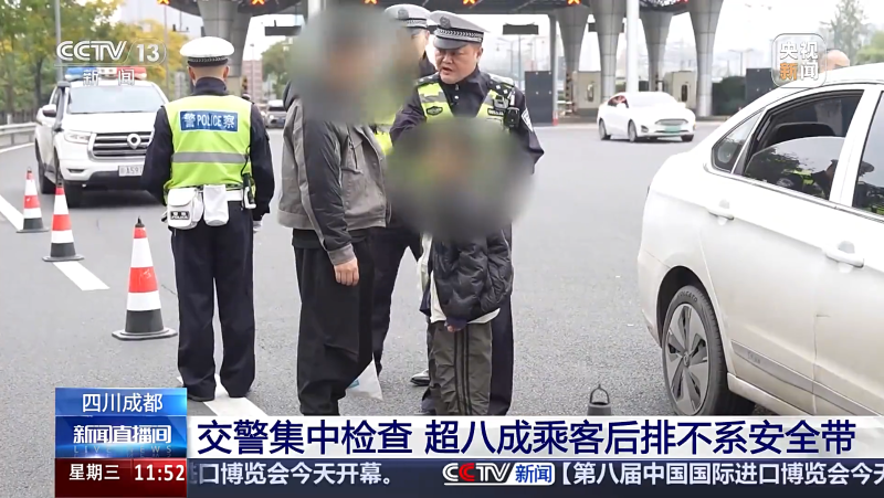 11月4日,四川成都交警在成都绕城高速锦城湖出口,开展针对后排乘客未系安全带违法行为的专项检查。在两个半小时的密集检查过程中,交警共检查车辆100余台,结果显示,超八成后排乘客均未按规定佩戴安全带。