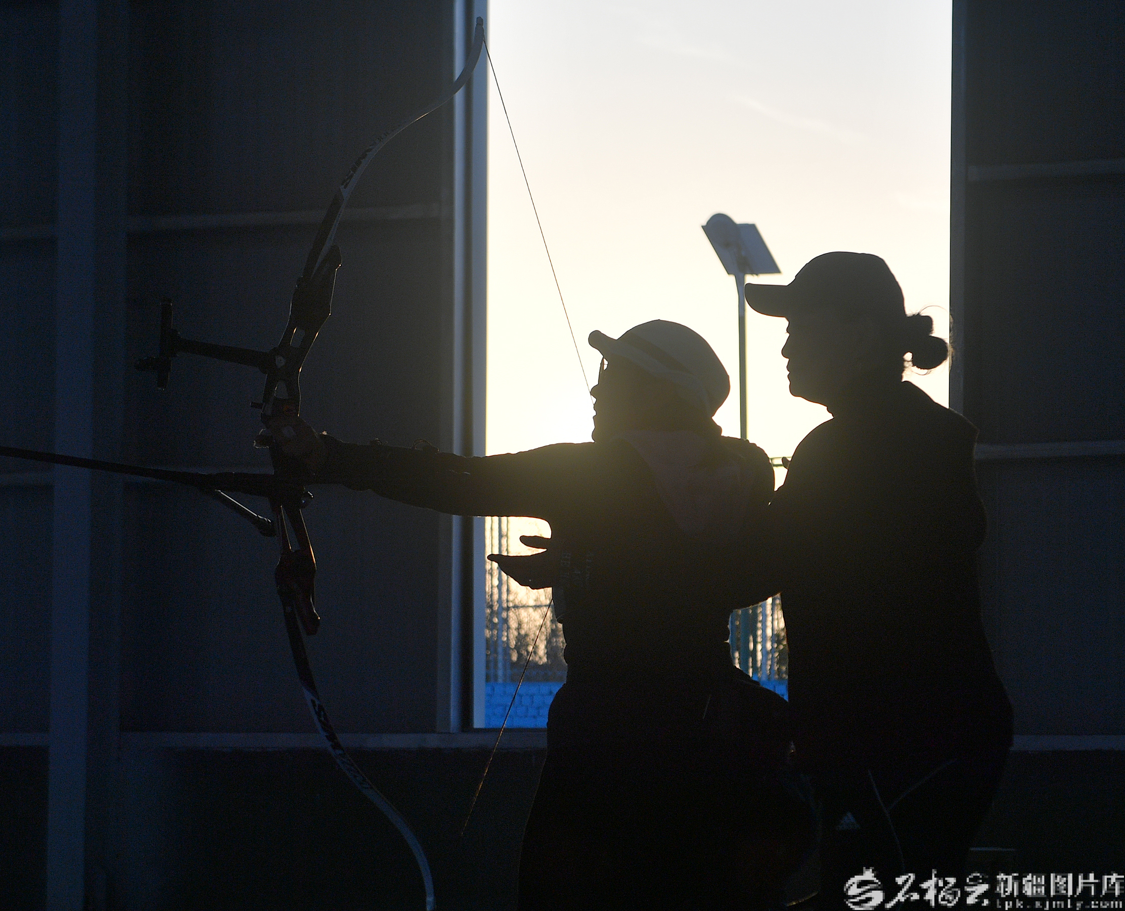 10月29日傍晚,射箭队教练王燕红(右)指导队员训练。