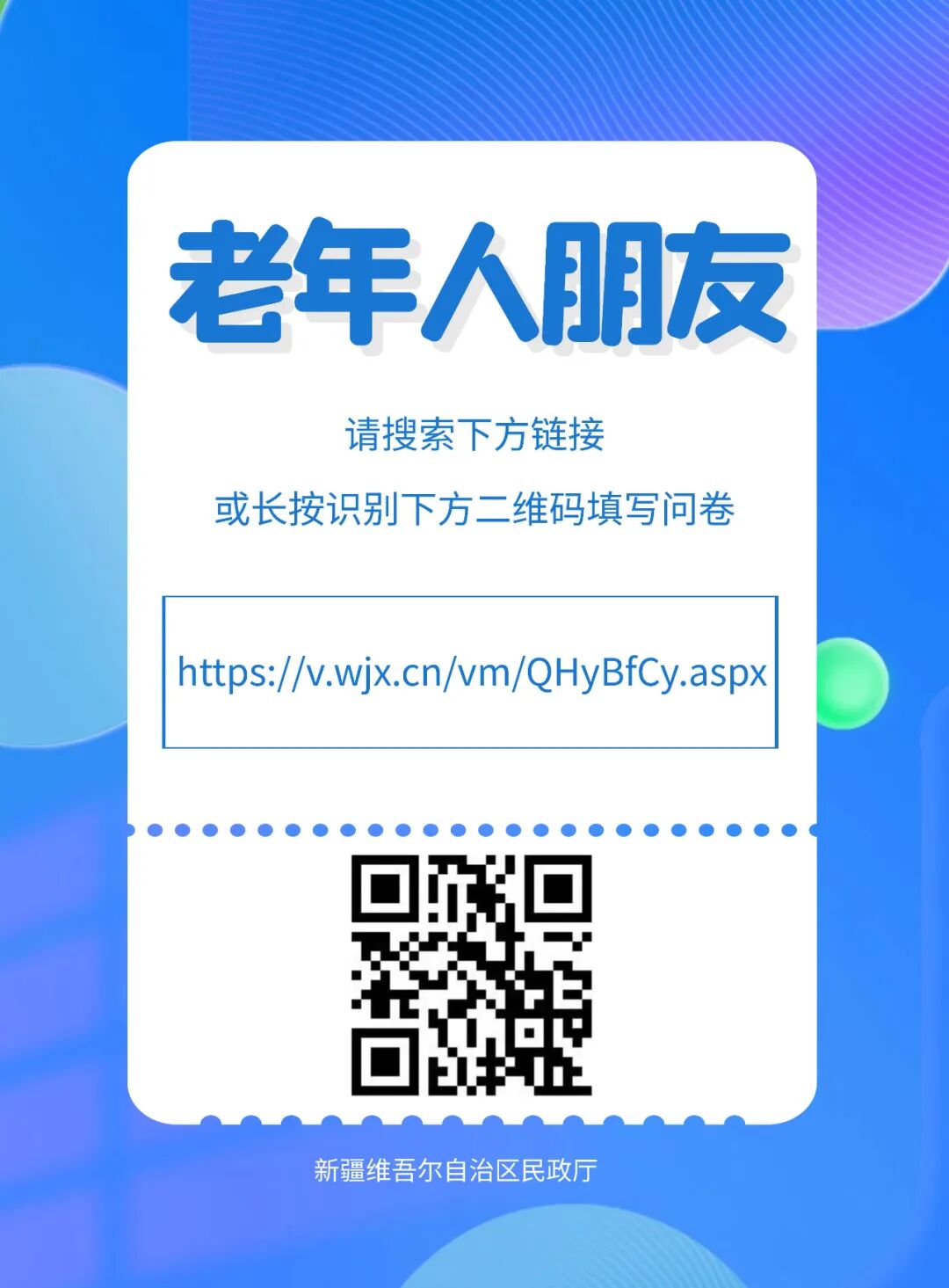 A+ A. A-天山网-新疆日报讯(记者李琳报道)为精准掌握人口老龄化发展趋势,深入了解各族群众养老服务需求,自治区民政厅近日在全区范围内启动养老服务体系建设问卷调查工作,面向社会广泛征集老年人及其子女的养老心声。