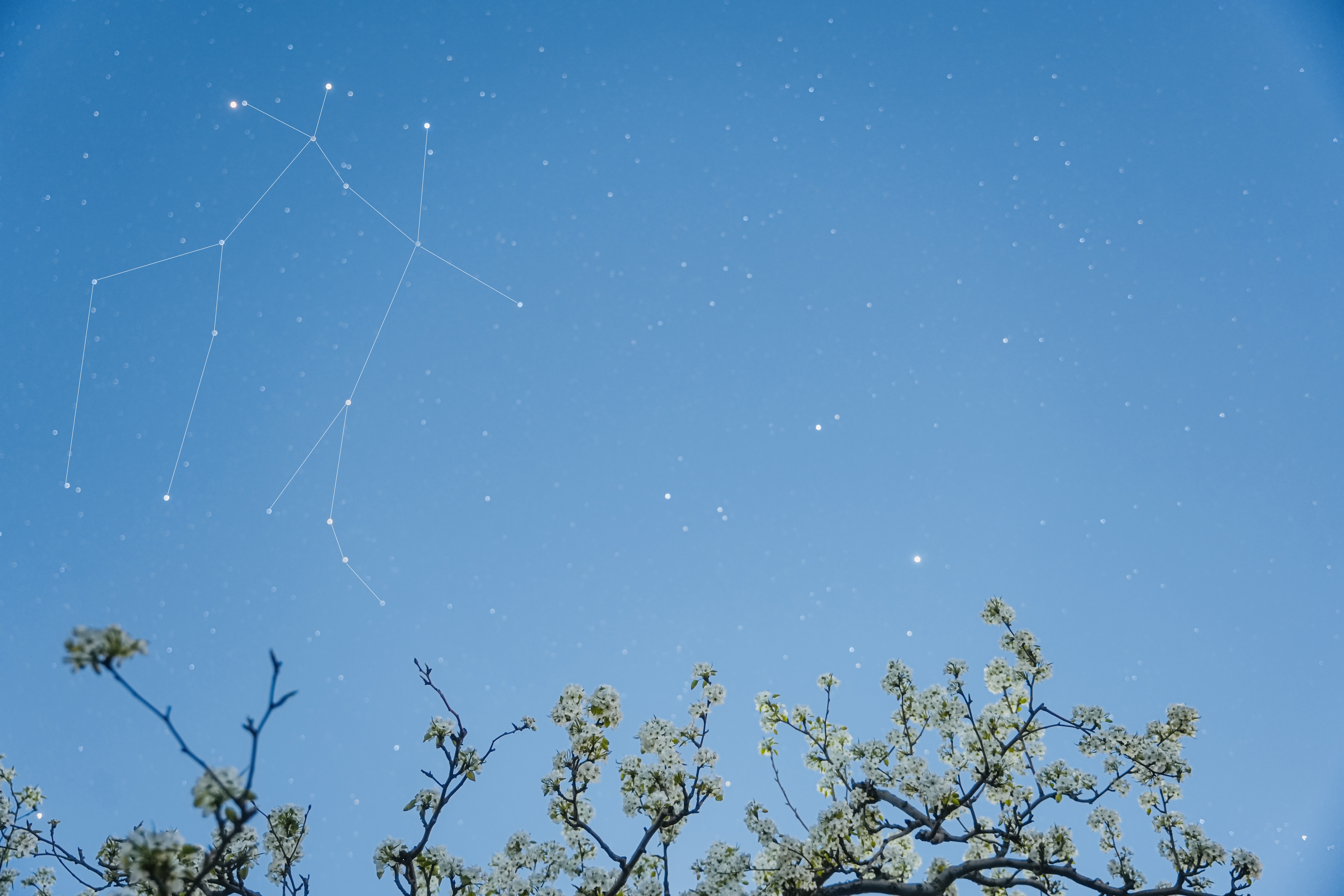 2025年4月2日,在北京市房山区琉璃河镇贾河村拍摄的梨花和双子座。(王俊峰 摄)
