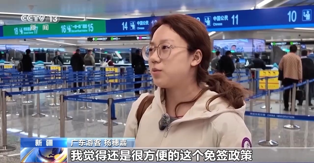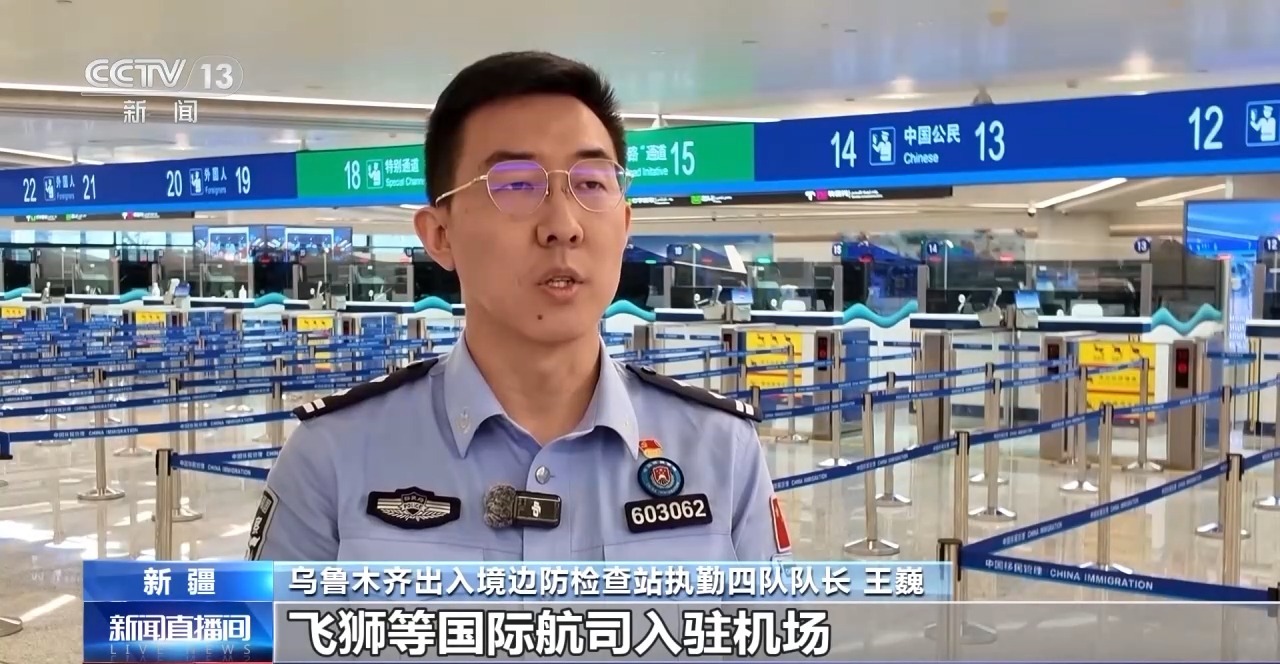 新疆乌鲁木齐出入境边防检查站执勤四队队长 王巍:在免签效应的带动下,今年又有斯卡特、飞狮等国际航司入驻机场,并加密了乌鲁木齐往返哈萨克斯坦的航班,目前每周往返航班保持在50架次左右,同比增长43%。