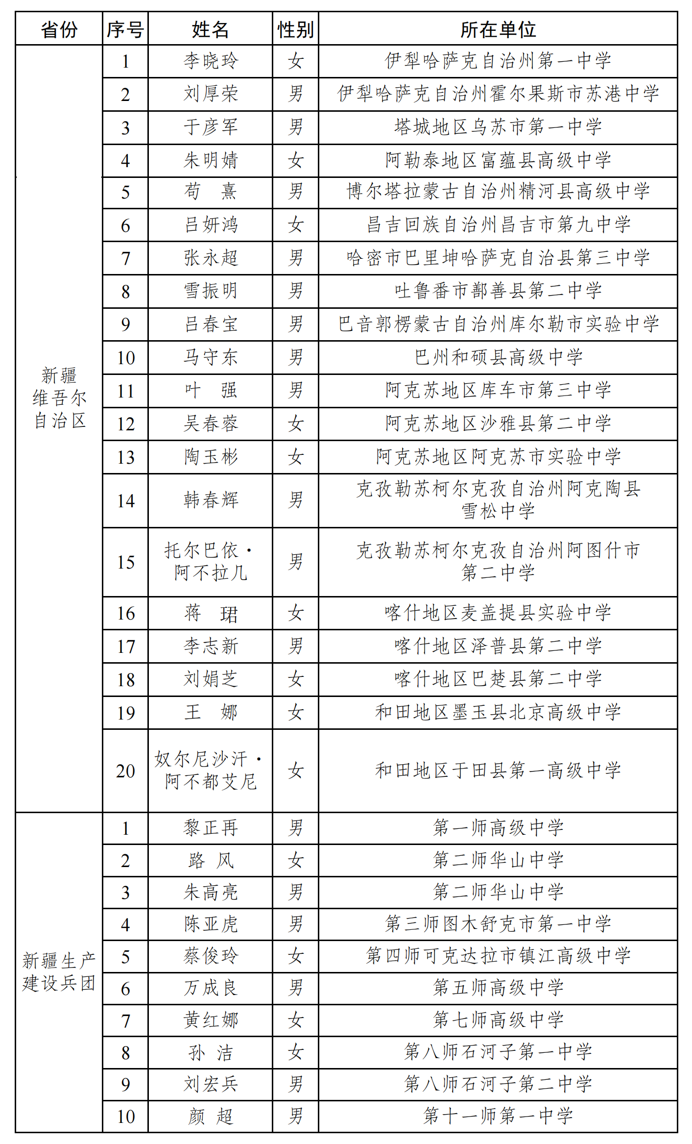 A+ A. A-近日,教育部网站公布了首批全国县域普通高中头雁教师岗位计划入选教师名单,共计600人,其中新疆(含兵团)30人(完整名单如下)。