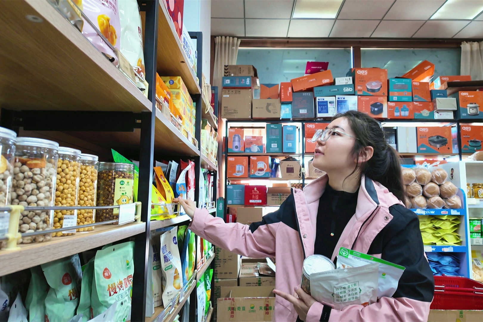 11月13日,在木垒县鹰哥特产超市里,消费者正在选购鹰嘴豆系列产品。石倩 摄