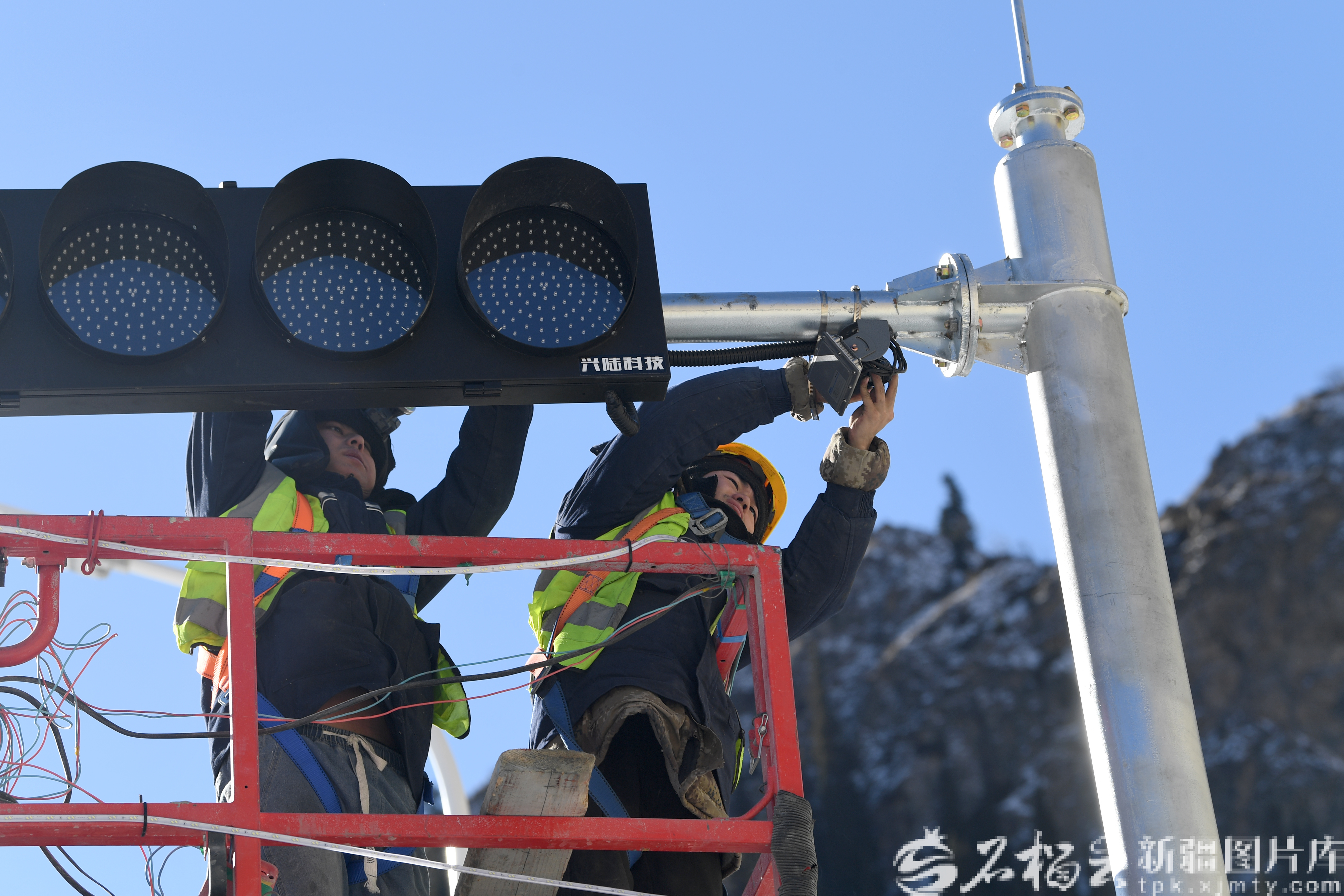 11月13日,施工人员在乌尉高速公路安装信号灯。