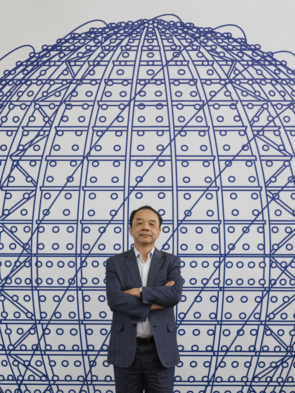 2025年11月18日,中国科学院院士、江门中微子实验项目经理王贻芳在中心探测器示意图前留影。新华社记者 金立旺 摄