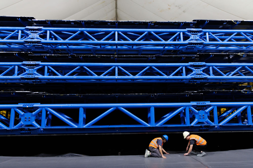 2025年11月18日,工人们正在江门中微子实验大厅铺设地垫,其顶上三层是缪子探测装置。新华社记者 金立旺 摄