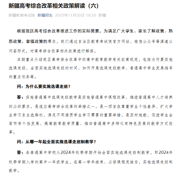 A+ A. A-11月20日,“新疆招生”微信公众号发布新疆高考综合改革相关政策解读,重点介绍我区高考综合改革中的高中教育教学有关政策规定,包括为何要实施选课走班、全面实施选课走班的时间、如何开展选课走班教学、普通高中学生发展指导的重点任务等。