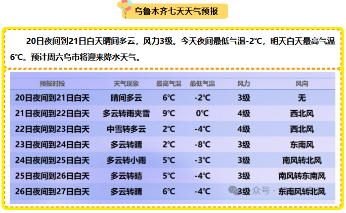 乌鲁木齐明天依旧是晴好“续航”,最高气温升至6℃,周六将切换“雨雪模式”。明天夜间至后天白天,大部区域多云转雨夹雪,南郊和山区多云转小到中雪,有4级左右西北风,达坂城区多云伴5至6级偏西风。