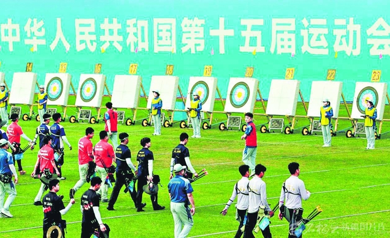11月15日,第十五届全国运动会射箭比赛现场,运动员走向靶位查看成绩。