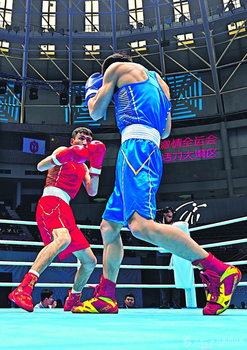 11月14日,第十五届全国运动会拳击男子60—63.5公斤级决赛中,新疆队选手伊卜拉伊木·马木提(左)获得银牌。