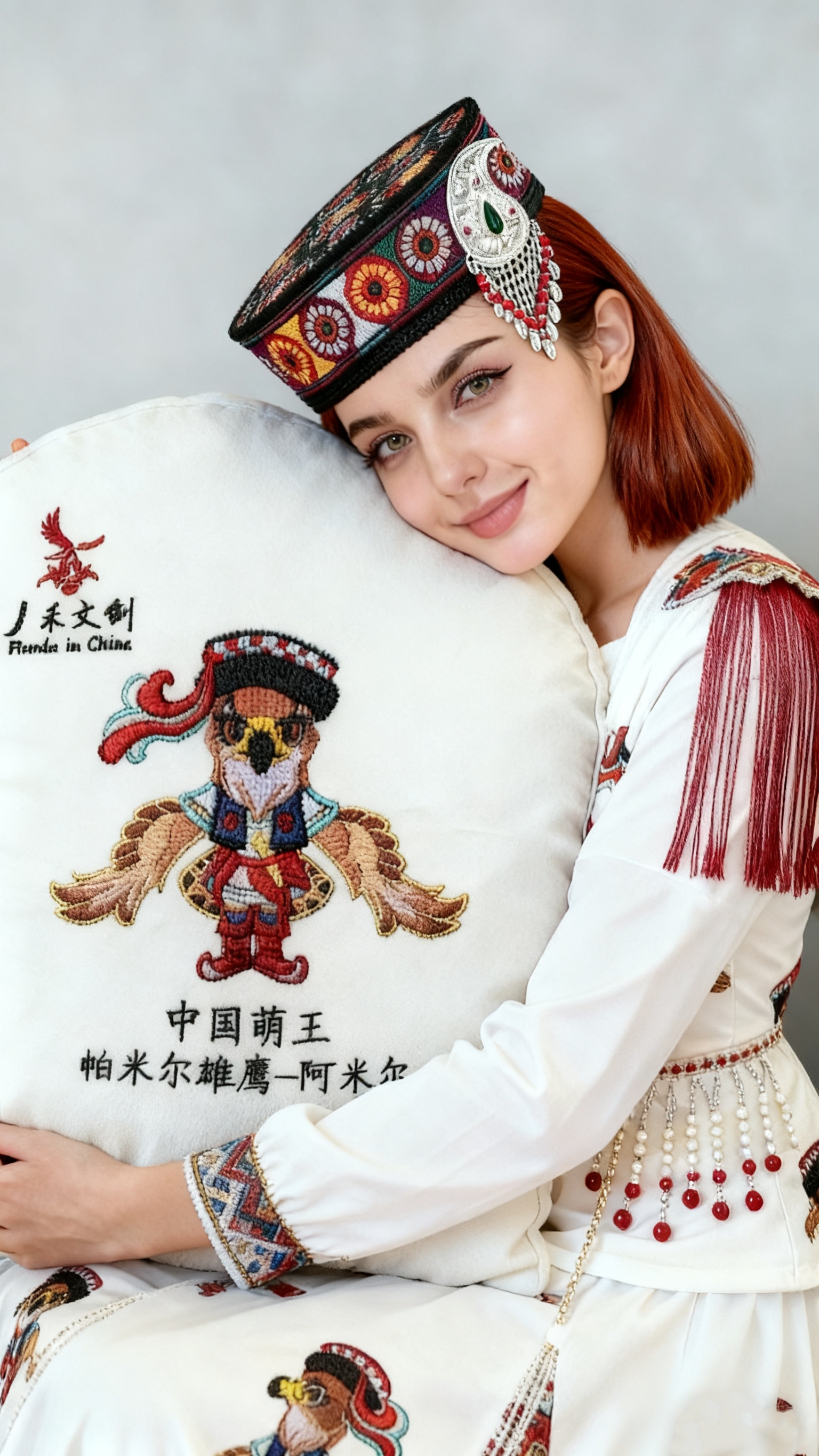 “阿米尔的名字灵感源自电影《冰山上的来客》中的同名角色,借助影片的广泛知名度,能让这一形象更快走进大众视野。”百合提妮莎介绍,“阿米尔”运用拟人化的艺术手法,对雄鹰形象注入现代审美。此外,“阿米尔”还融合了新疆非遗元素,包括塔吉克族婚俗、服饰、刺绣工艺、鹰舞等。主色调采用红白两色,红色代表热情与生命力,白色则象征着帕米尔高原的雪山与纯洁。色彩搭配既符合现代审美,又深深植根于中华优秀传统文化。