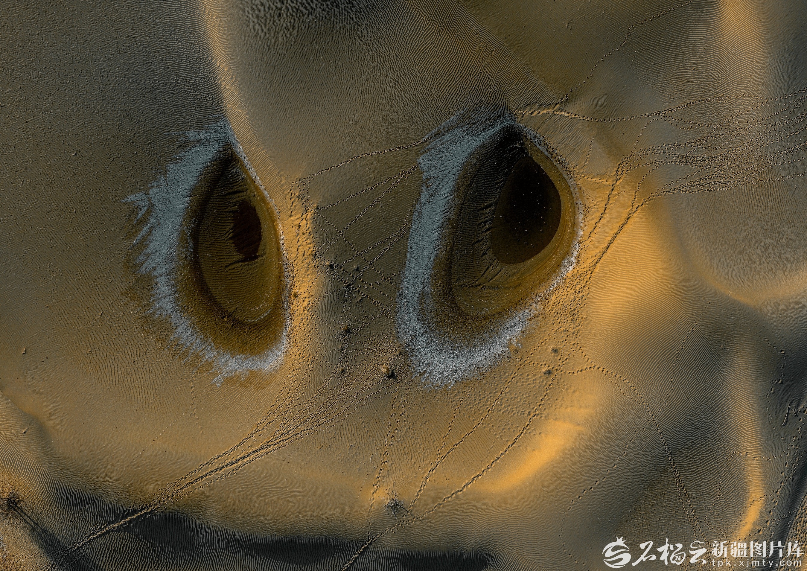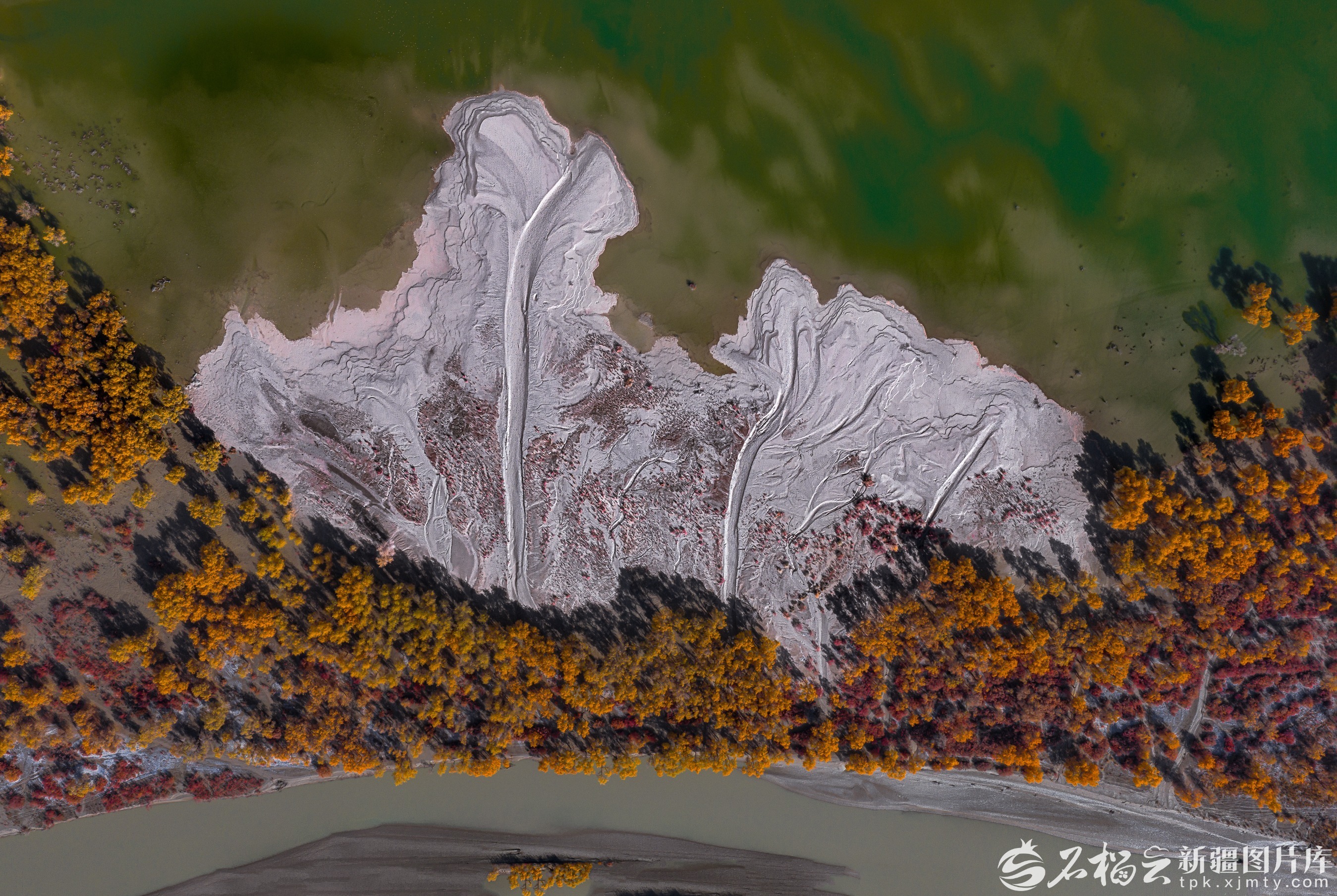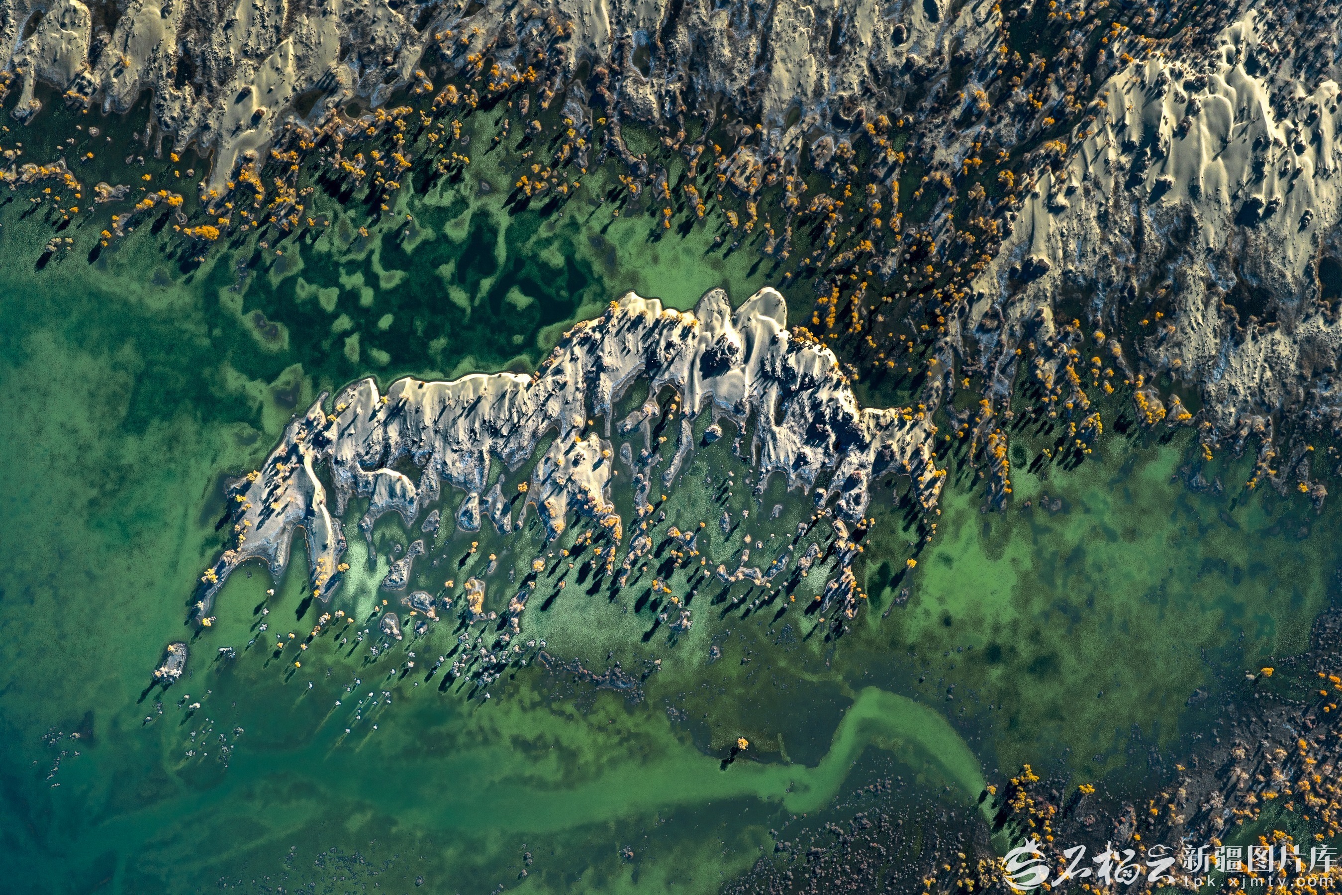 近日,马立新在尉犁县境内塔克拉玛干沙漠腹地,首次拍摄到了一处沙漠胡杨“秘境”。更神奇的是,从高空俯瞰,8个小湖泊在沙海中相对集中,与金色的胡杨共同构成了一幅“沙水相依,水映胡杨”的绝美画卷,整体形态宛如一只展翅欲飞的金凤凰,因此他将此处命名“凤凰岛”。